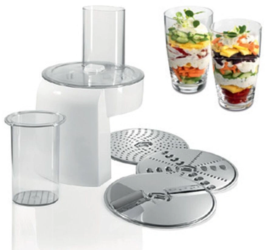 - КомплектацияКрюк для теста, венчик для жидкого теста, венчик для взбивания. Универсальная резка с 3 режущими дисками (двусторонняя терка, двусторонняя шинковка, терка для сыра/ шоколада/ орехов).