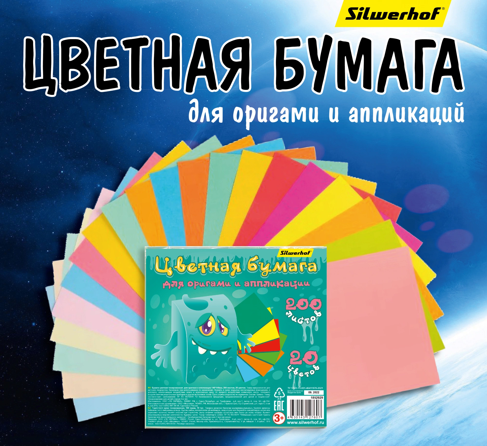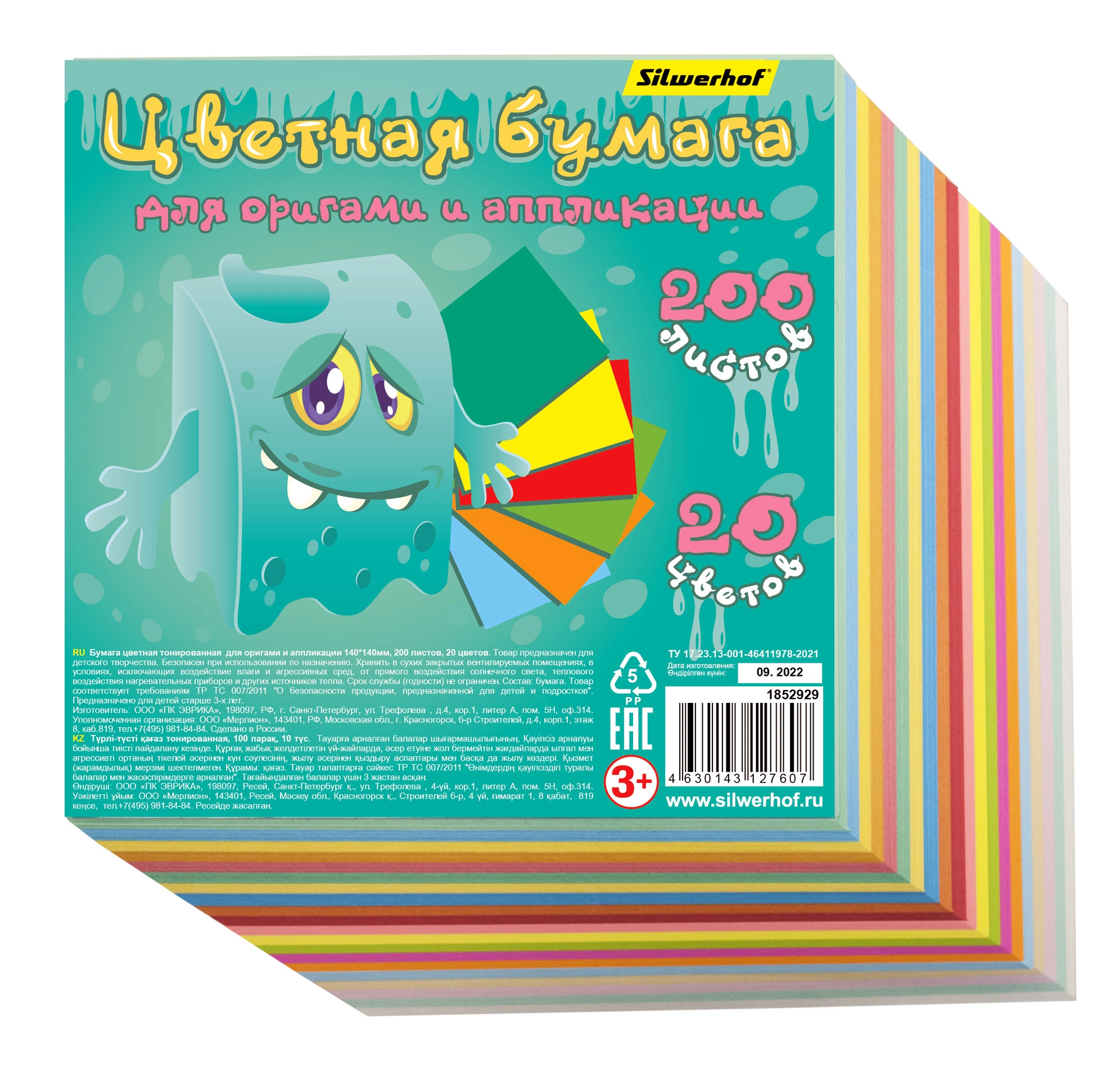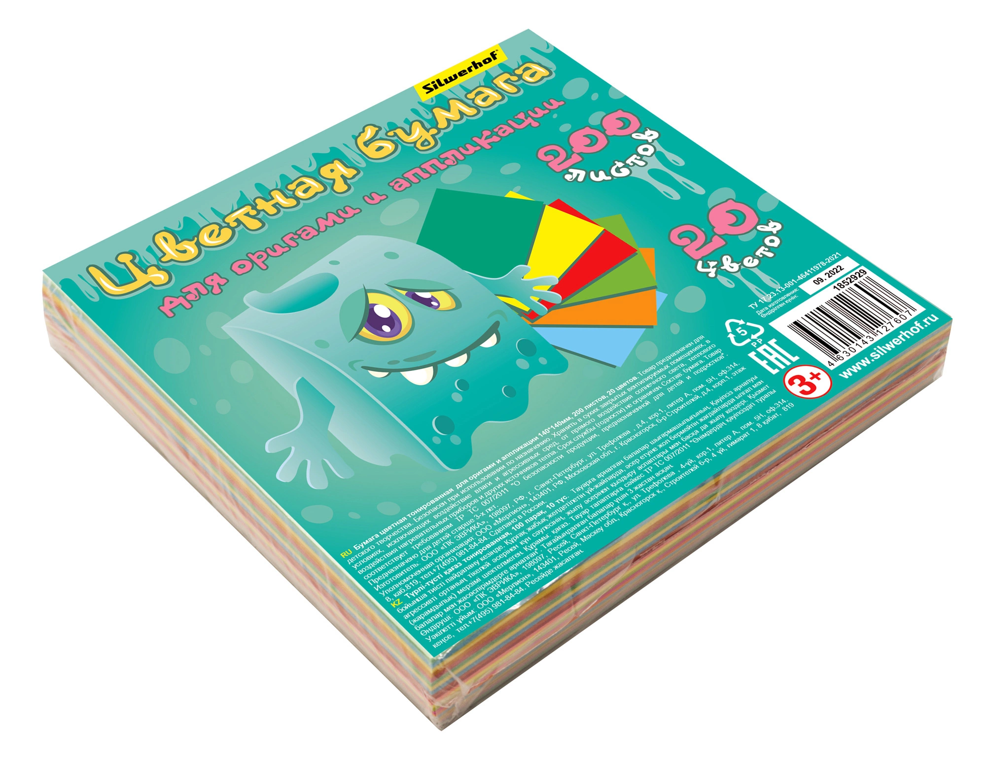 Бумага цветная Silwerhof для оригами и аппликации ассорти тонир. 200л. 20цв. Монстрики 80г/м2 140х140мм