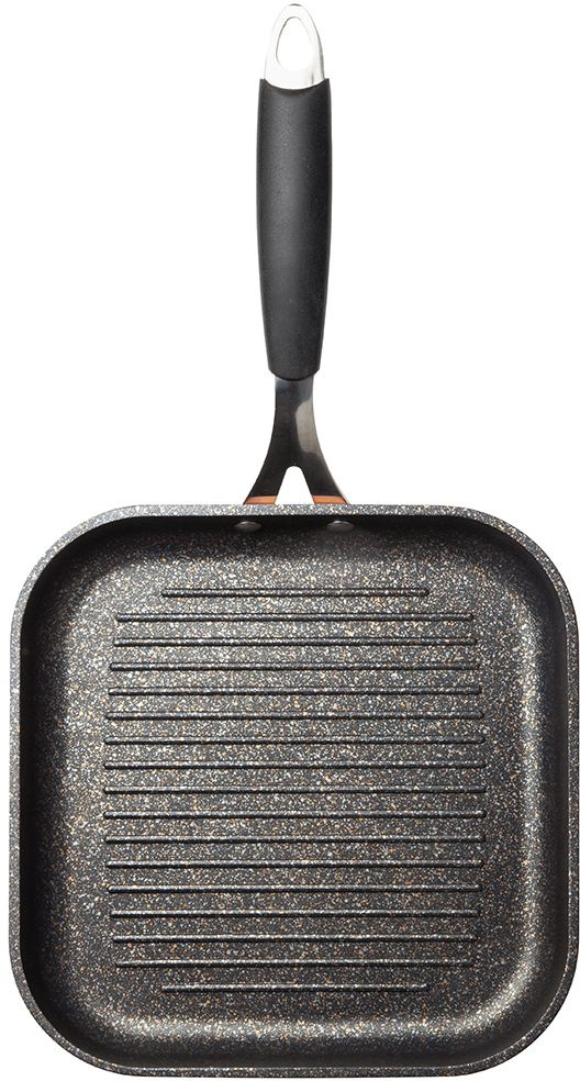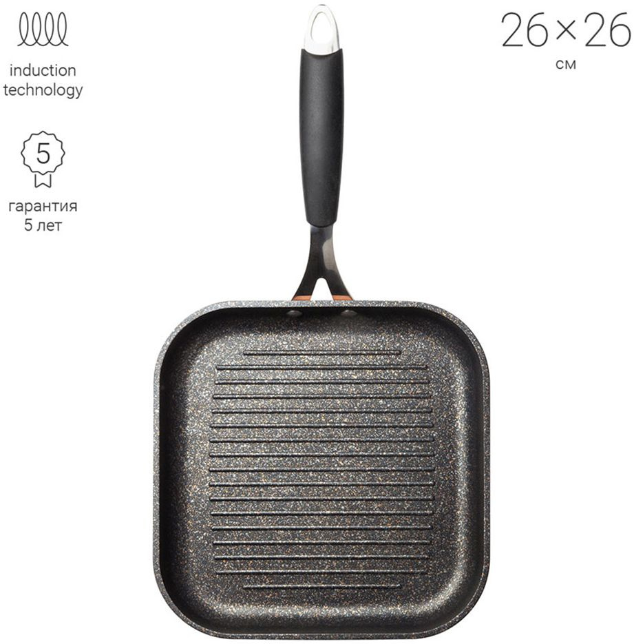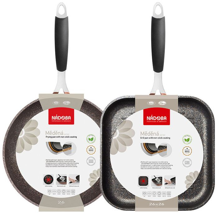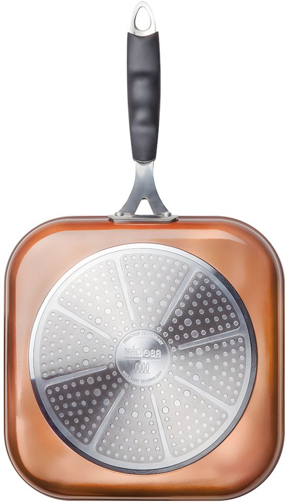 Корпус сковороды-гриль NADOBA Medena 26х26 см изготовлен из кованого алюминия. Прочное 5-слойное японское антипригарное покрытие POLYGO MAXXI, без PFOA. Внешнее покрытие под медь. Допустимо использование металлических инструментов. Ненагревающаяся ручка из нерж.стали с силиконовым покрытием.