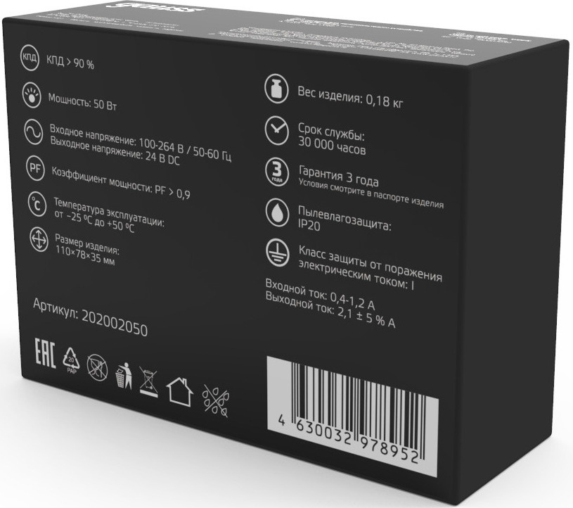 Блок питания Gauss 202002050 встраив. для лен.светод. черный