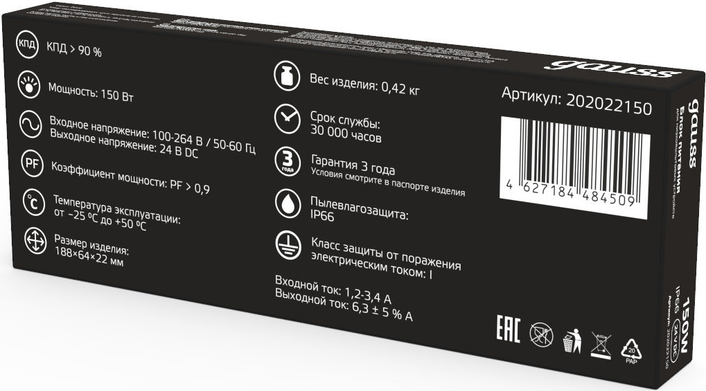 Блок питания Gauss 202022150 пониж. для лен.светод. черный