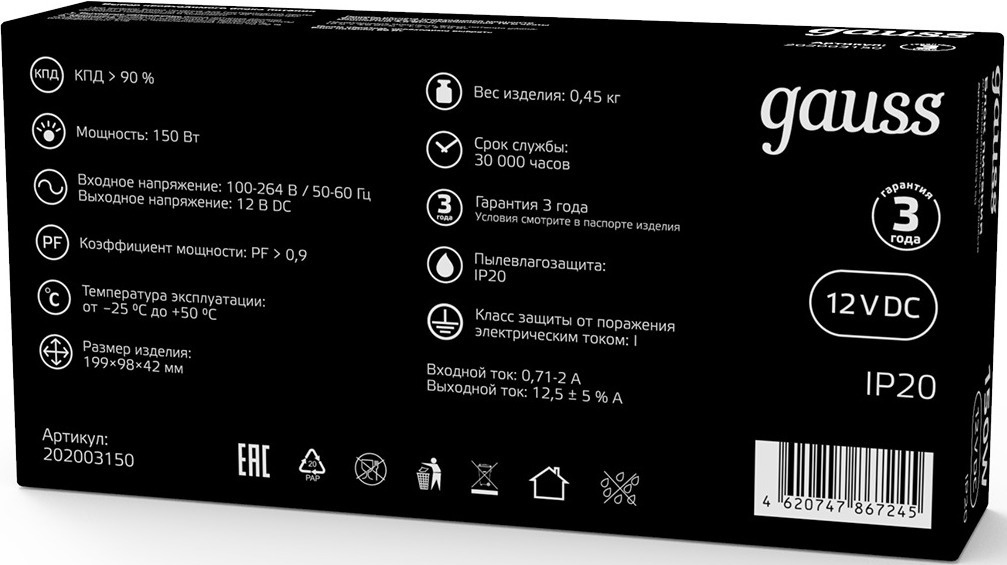 Блок питания Gauss 202003150 встраив. для лен.светод. черный