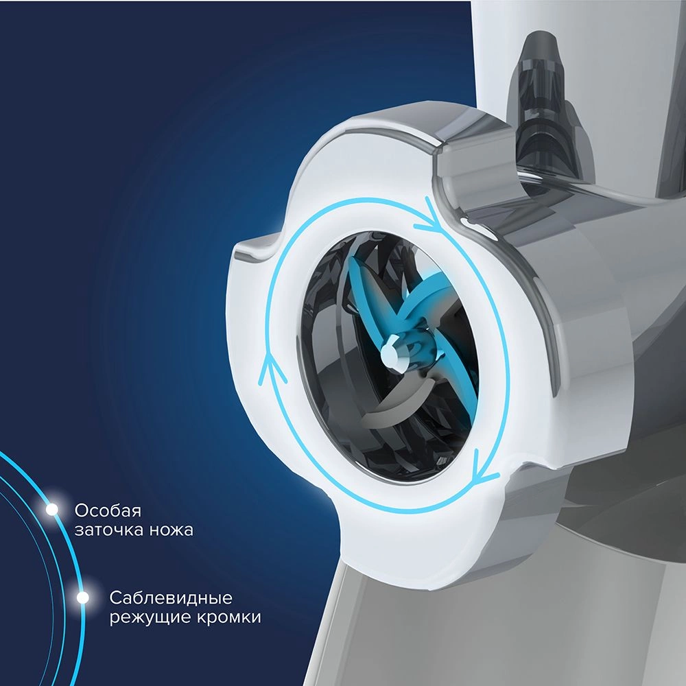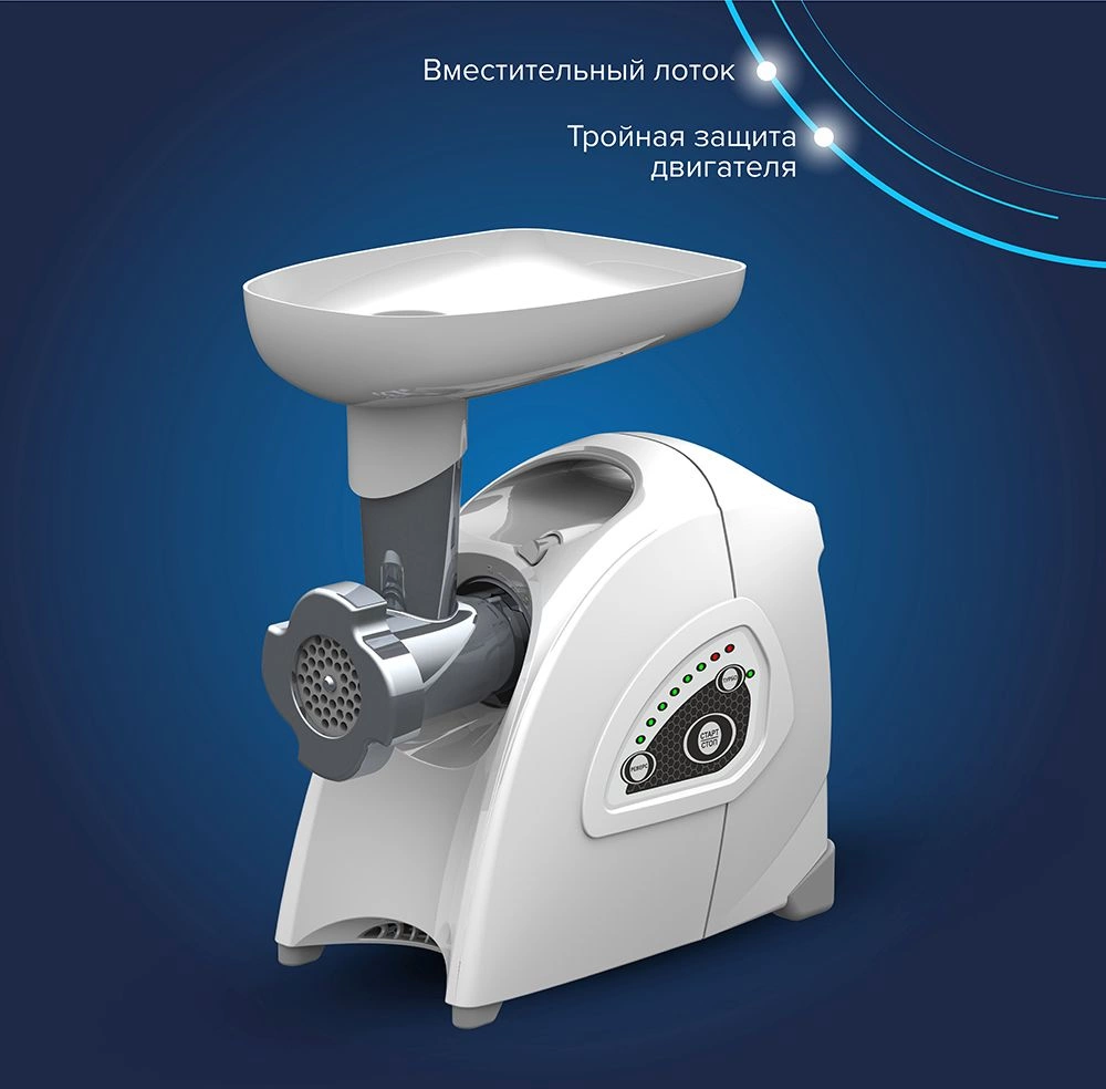 Тройная защита от перегрузки,световая индикация загрузки двигателя, электронное управление,функция реверс,2 скорости переработки продуктов, соковыжималка для цитрусовых, ручка для переноски, реверс, увеличенное время непрерывной работы – 30 минут, возможность вертикального хранения.