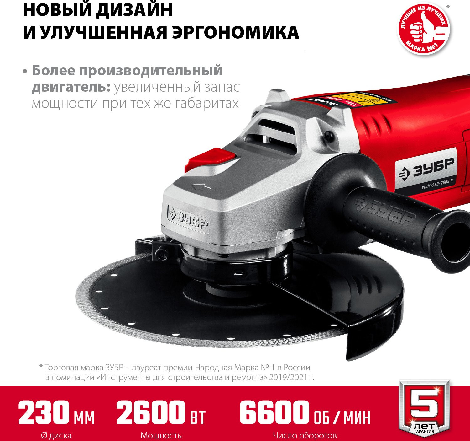 Углошлифовальная машина Зубр Мастер УШМ-230-2605 П 2600Вт 6600об/мин рез.шпин.:M14 d=230мм