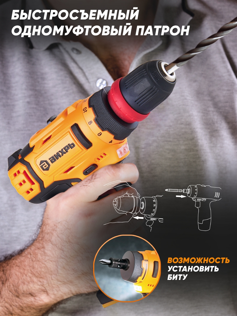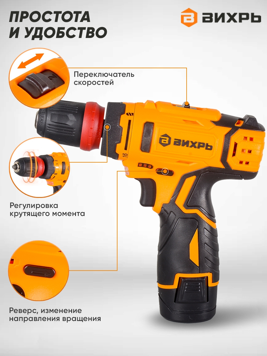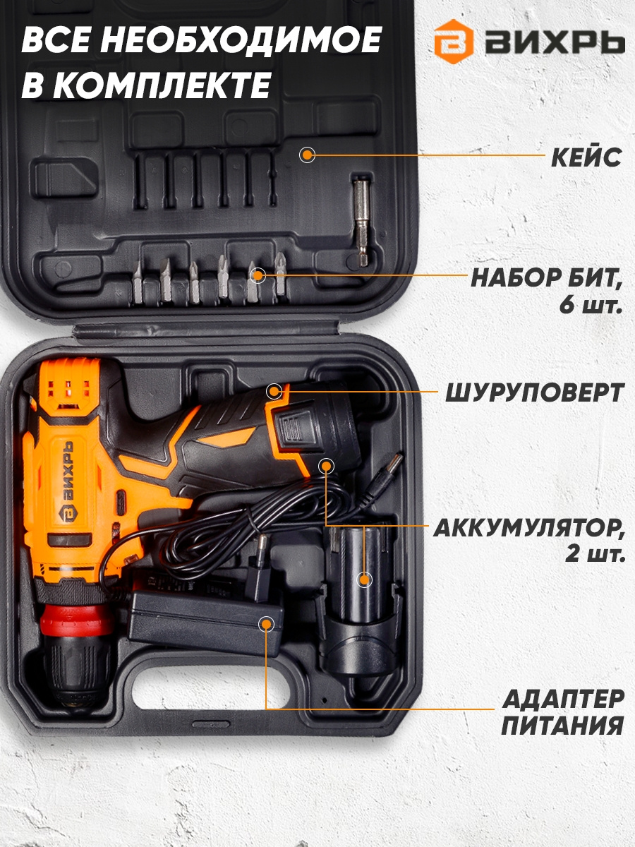 Дрель-шуруповерт Вихрь ДА-12Л-2КC аккум. патрон:быстрозажимной (кейс в комплекте) (72/14/33)