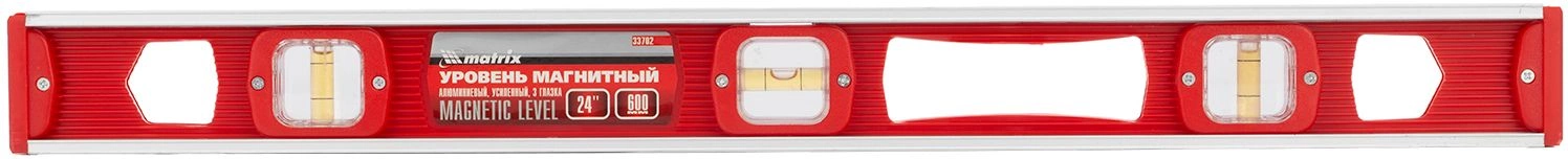 Магнитный уровень Matrix 33702 длиной 600 мм. — это измерительный инструмент с 3 глазками для проверки горизонтальных и вертикальных поверхностей. Пригодится на строительной площадке или в быту при выравнивании поверхностей, монтаже конструкций, отделке помещений и других операциях.