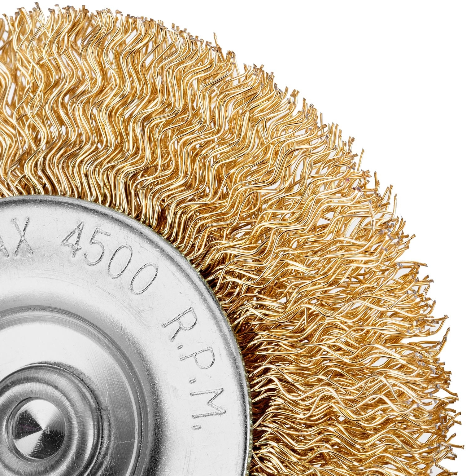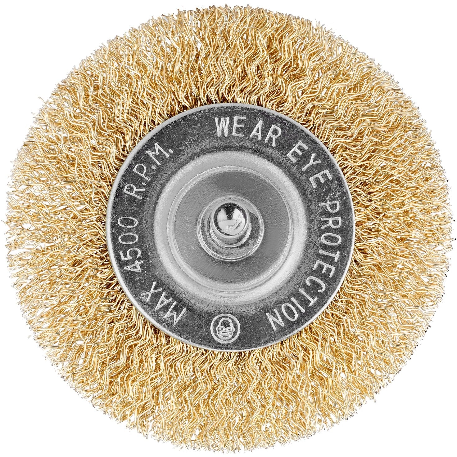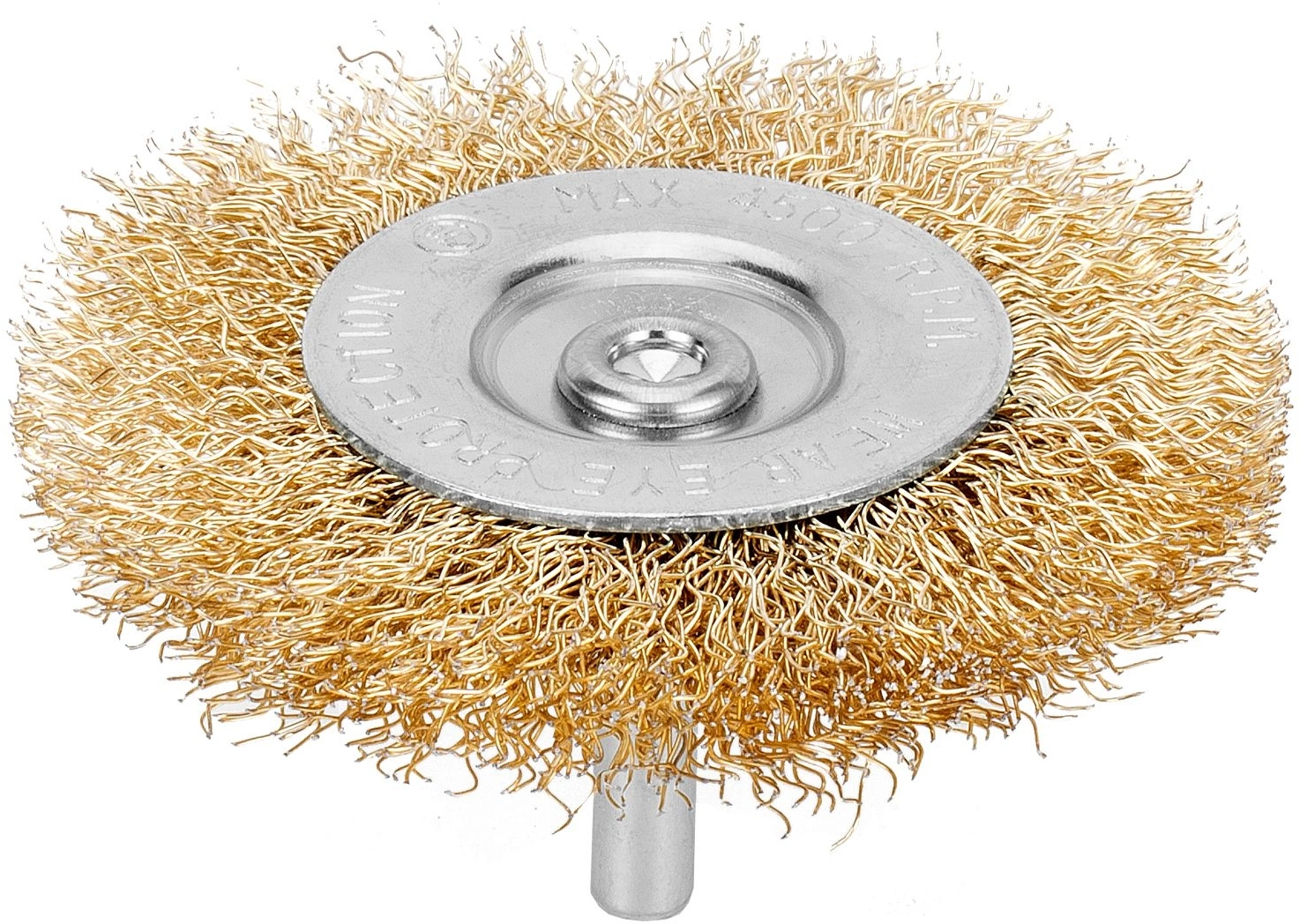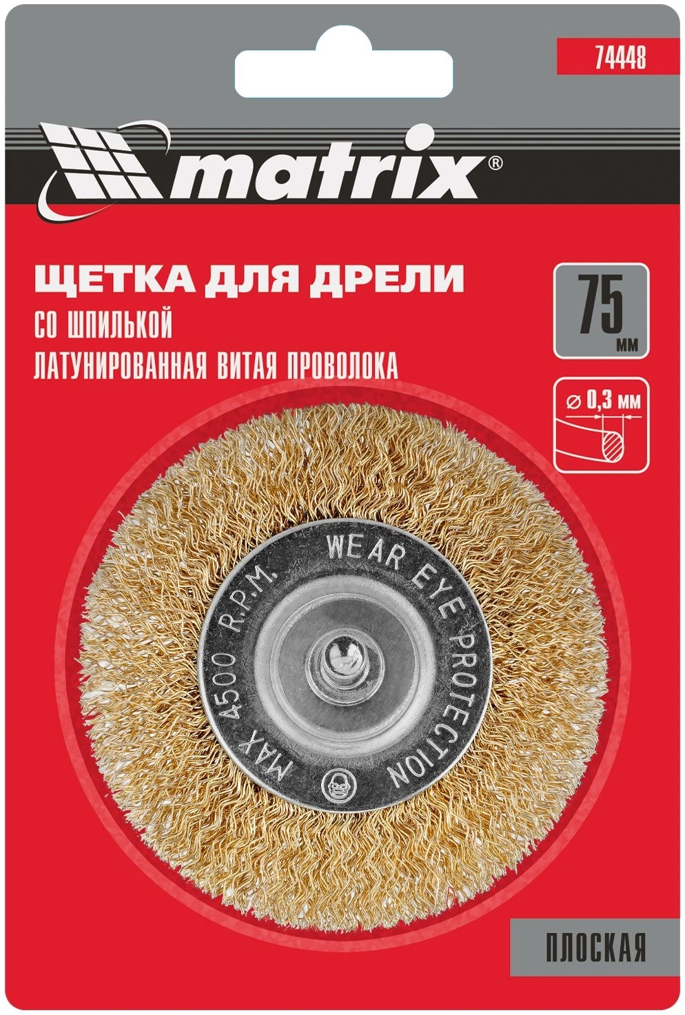 Плоская щетка для дрели Matrix 74448 диаметром 75 мм, со шпилькой, с щетиной из латунированной витой проволоки, предназначена для бережной очистки металлических, деревянных, пластиковых поверхностей от загрязнений, старых лакокрасочных материалов и ржавчины.