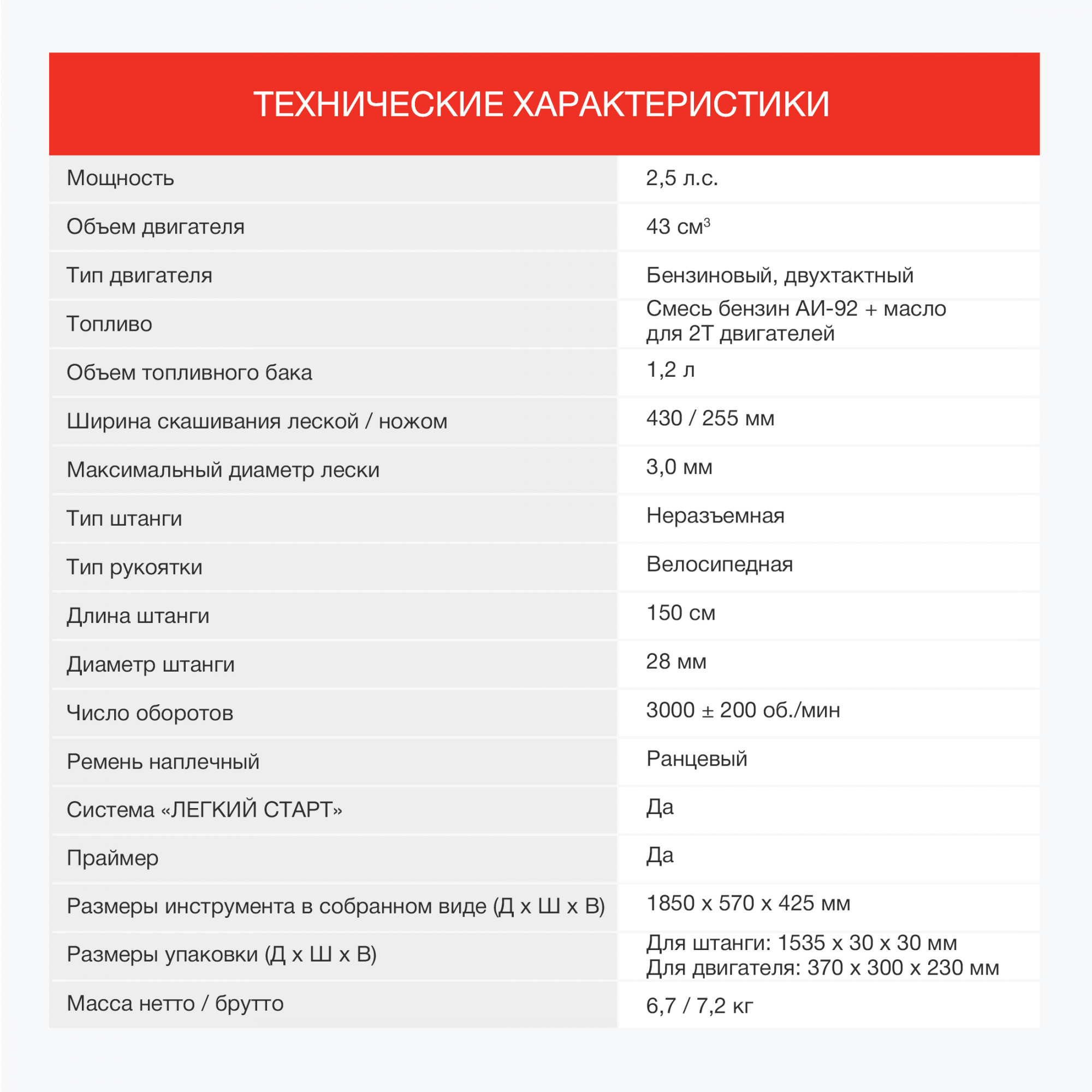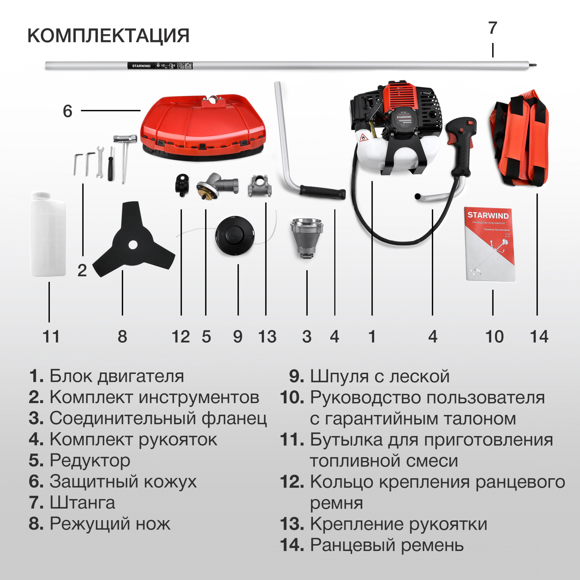 - Комплект поставкиБлок двигателя, Штанга, Комплект крепежа, Комплект рукояток, Ранцевый ремень, Защитный кожух, Бутылка, Нож, Шпуля с леской