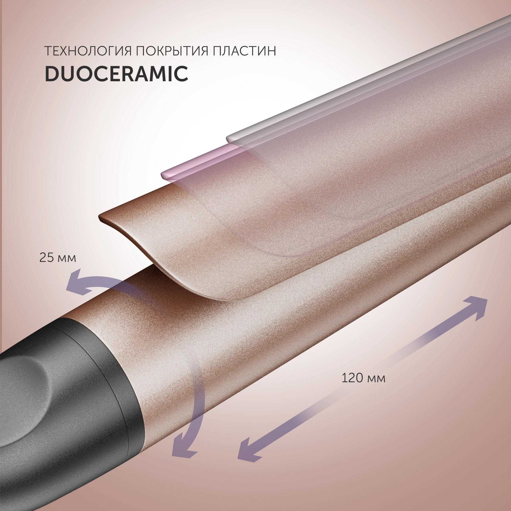 встроенный генератор ионов, турмалиновое покрытие, увеличенная рабочая поверхность 120 мм, 5 температурных режимов, диаметр щипсов 25 мм