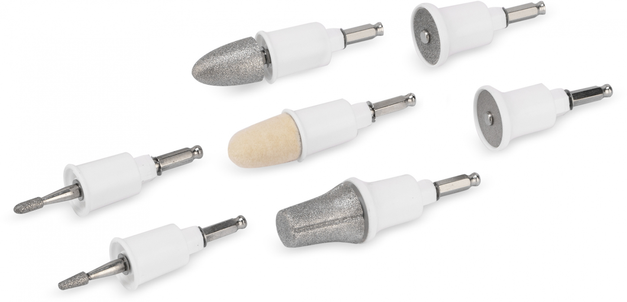- Насадкинасадка для шлифовки ногтя, удаления натоптышей,огрубевшей кожи и мазолей на руках - 1 шт; цилиндрическая насадка для шлифовки основания ногтя - 1 шт; насадка для придания формы - 2 шт; войлочная насадка для полировки ногтя -1 шт.; малый диск дляй шлифовки - 1 шт.; большой диск шлифовки- 1шт.