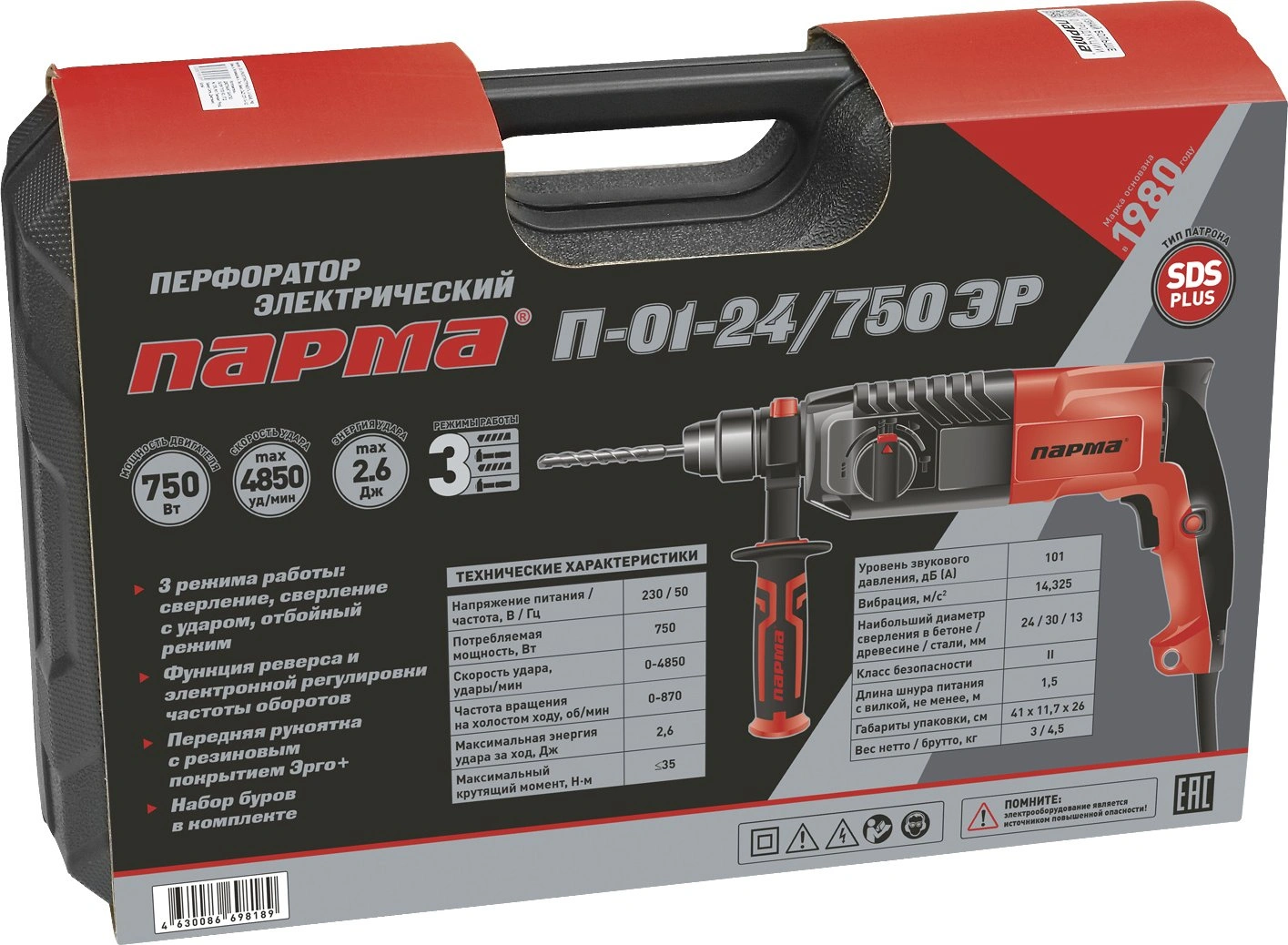Перфоратор Парма П-01-24/750ЭР патрон:SDS-plus уд.:2.6Дж 750Вт (кейс в комплекте)