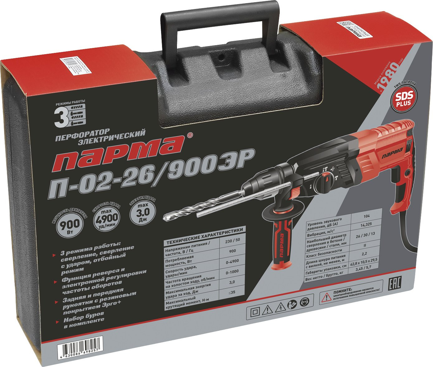 Перфоратор Парма П-02-26/900ЭР патрон:SDS-plus уд.:3Дж 900Вт (кейс в комплекте)