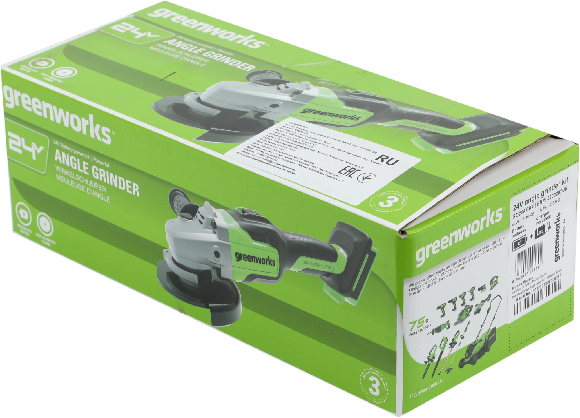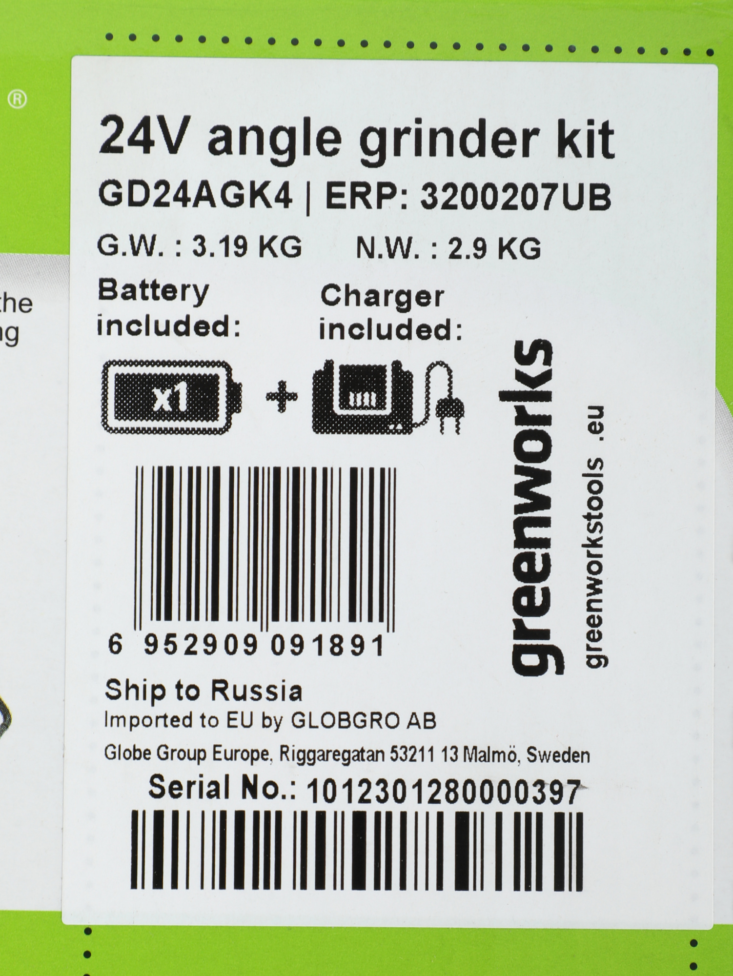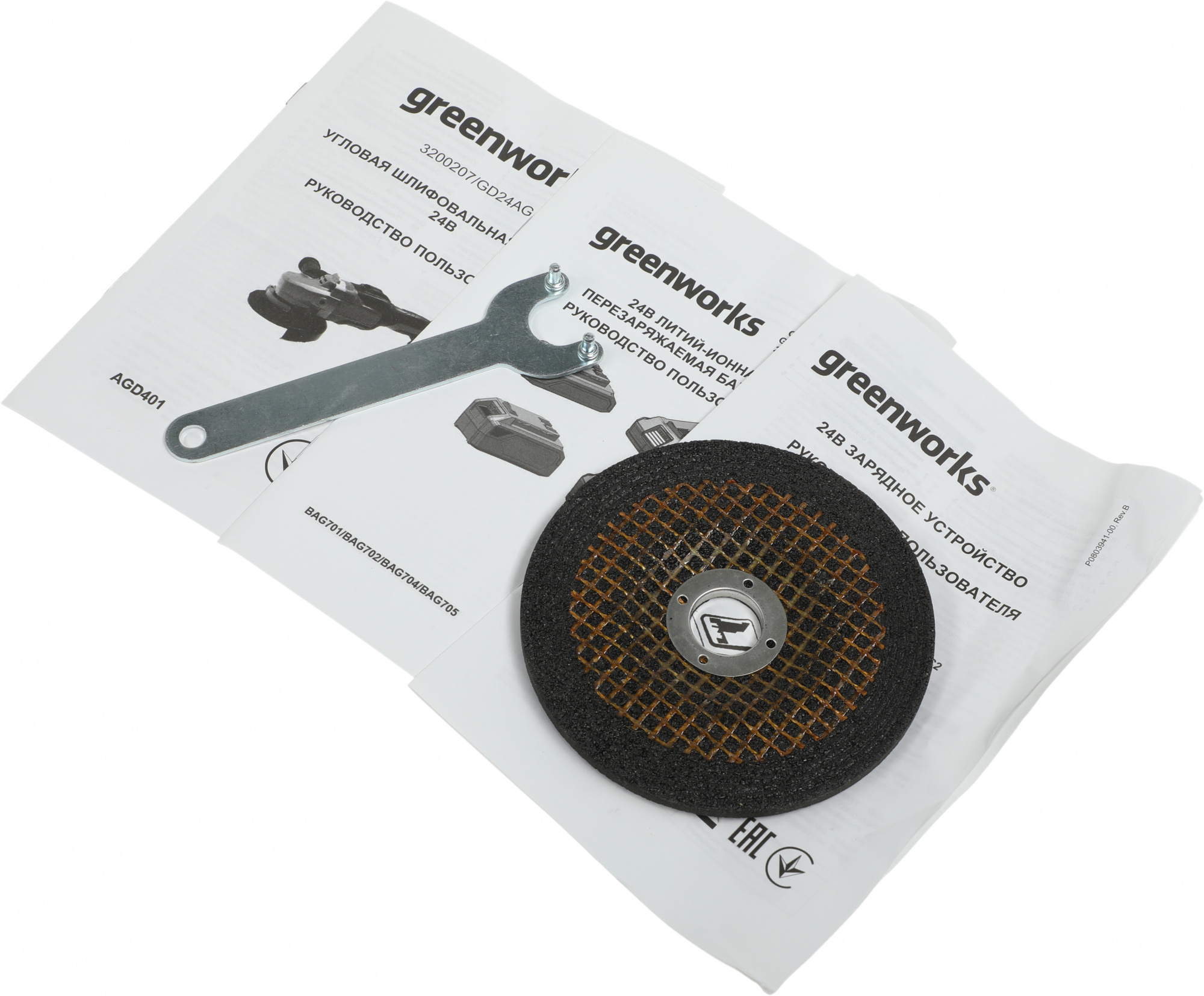 - Комплект поставкиУгловая шлифовальная машина (болгарка) Greenworks 24V, арт. 3200207; боковая рукоятка; ключ для монтажа диска; аккумулятор Greenworks, 24V, 4 Ач; зарядное устройство Greenworks 24V, 4А; руководство по эксплуатации; гарантийный талон; удобная сумка-переноска.