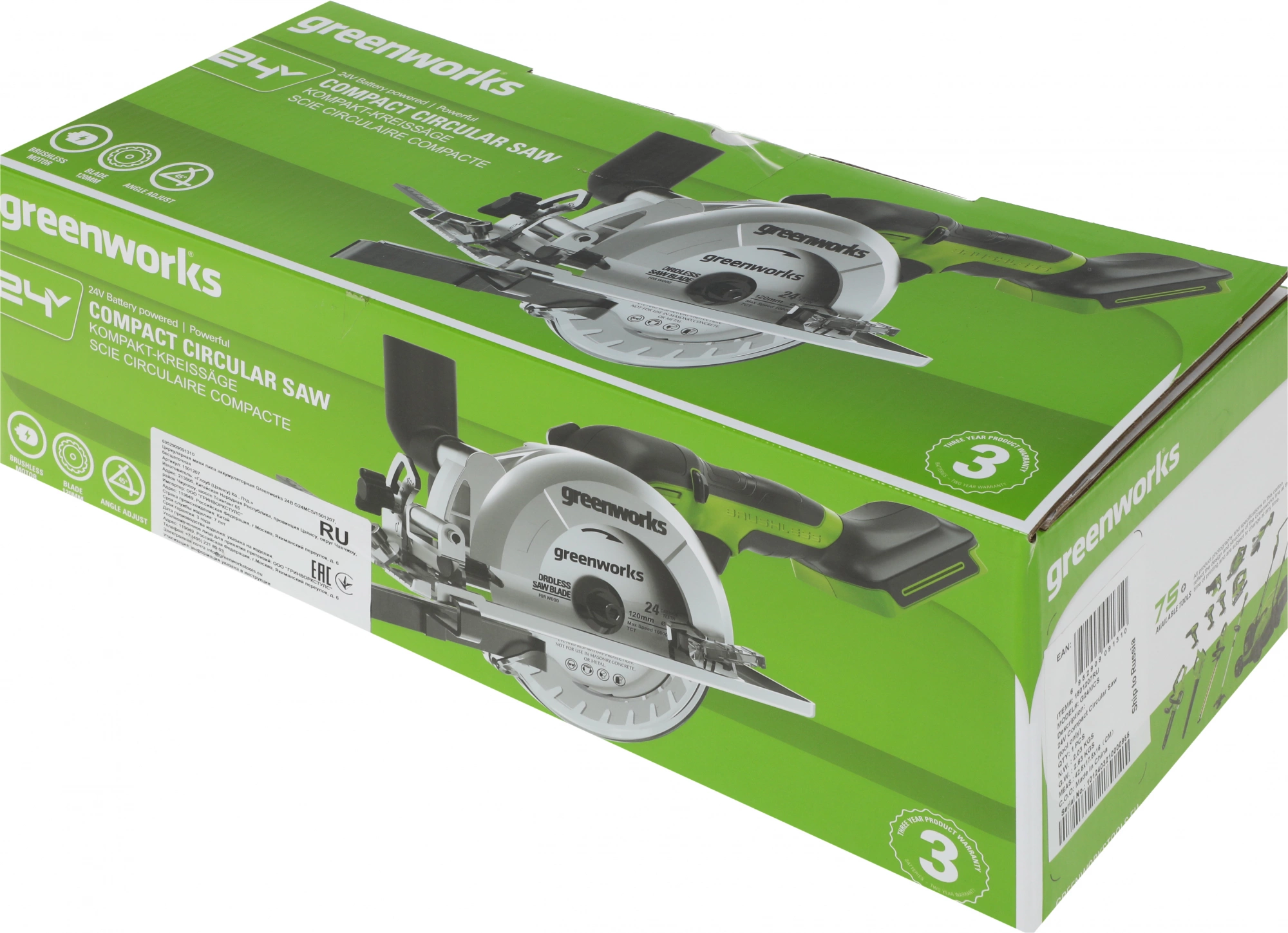 - Комплект поставкиПила циркулярная аккумуляторная 24V GREENWORKS G24MCS, руководство пользователя, упаковка, защитный кожух.