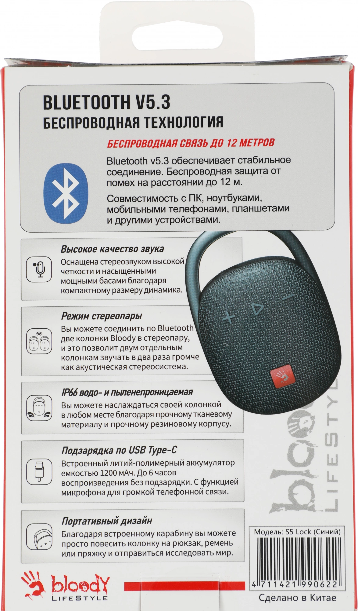 Колонка порт. A4Tech Bloody S5 Lock синий 5.5W 1.0 BT 12м 1200mAh (S5 LOCK BLUE)