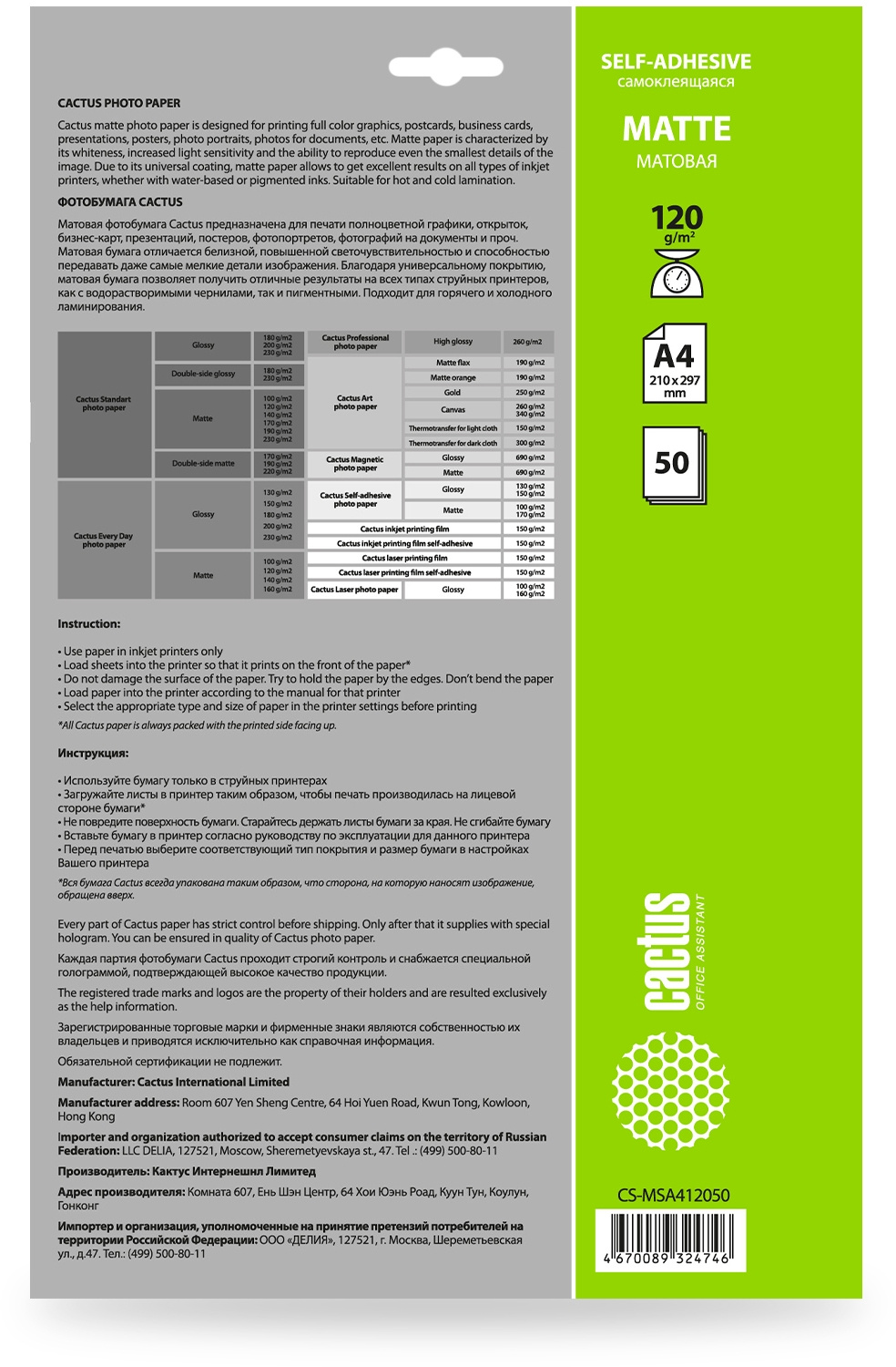 Фотобумага Cactus CS-MSA412050 A4/120г/м2/50л./белый матовое самоклей. для струйной печати