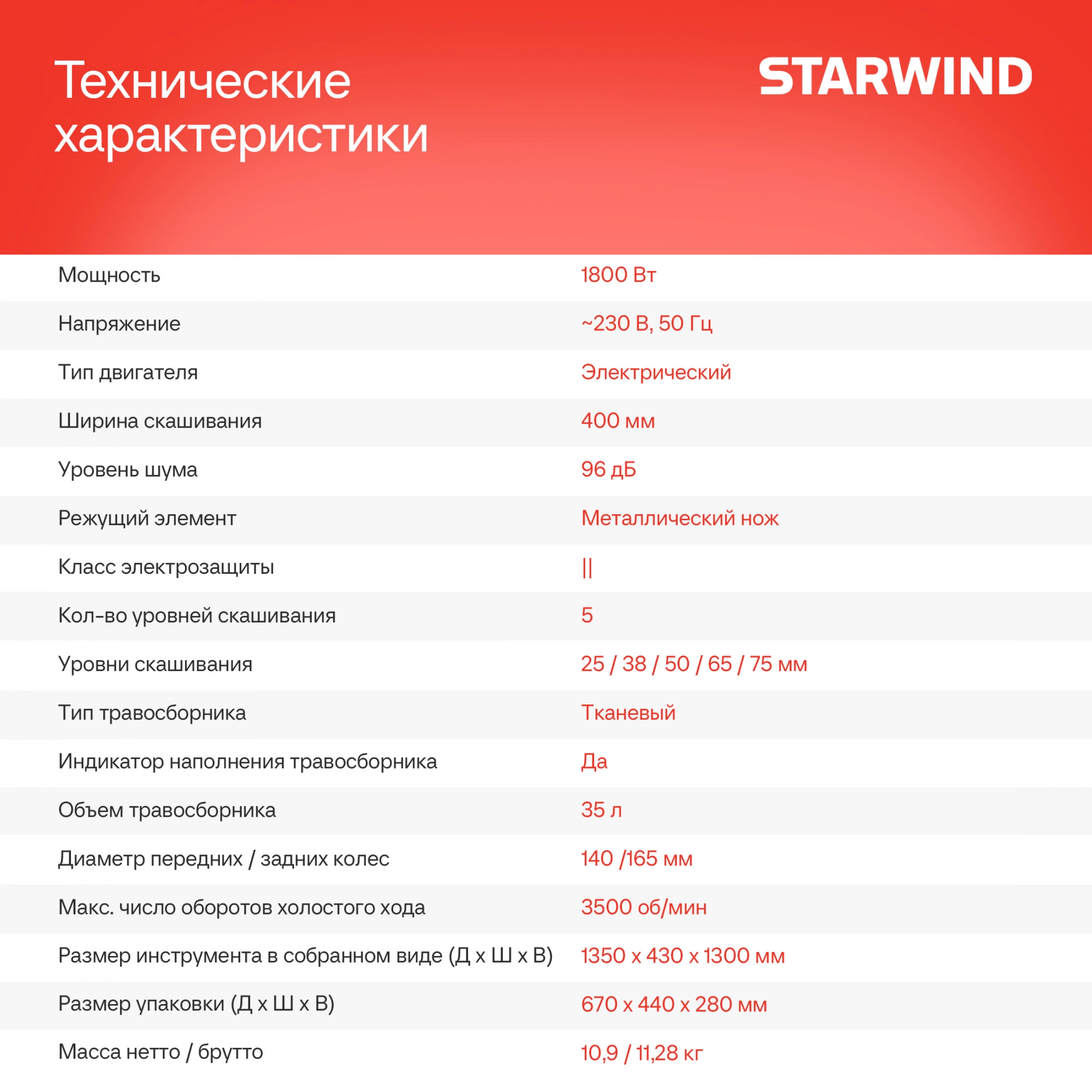 Газонокосилка роторная Starwind ELM-1800 1800Вт