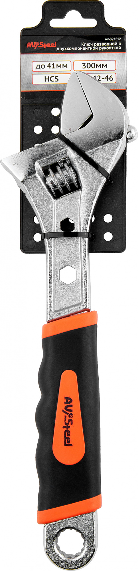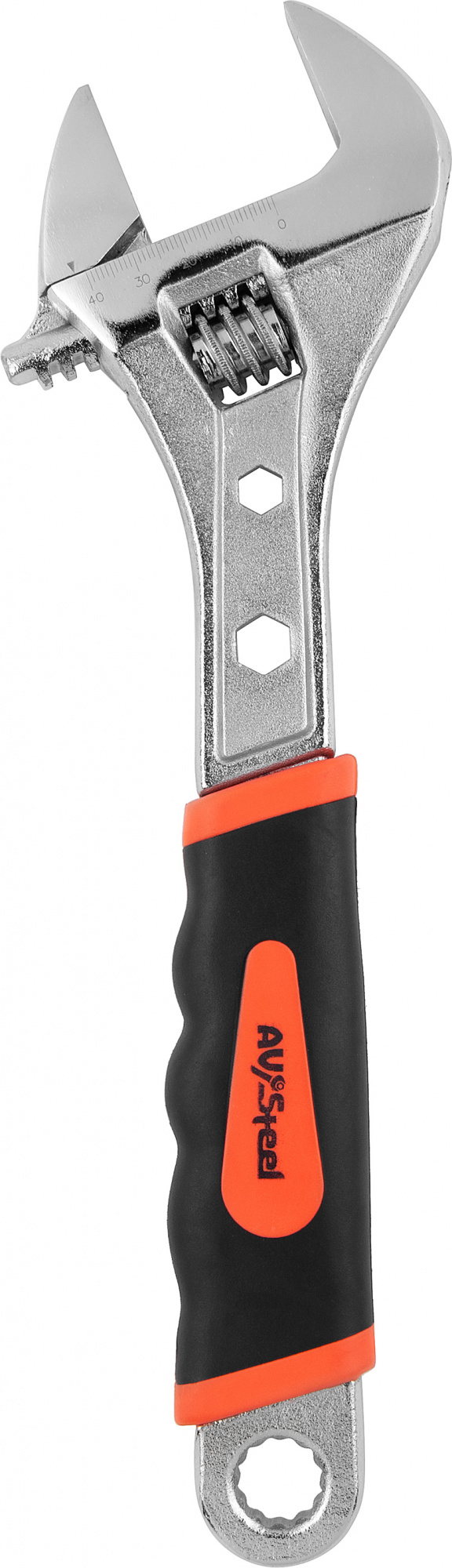 Ключ разводной AV Steel 300 мм подойдет в качестве универсального инструмента, который охватывает сразу несколько размеров. Наличие противоскользящей рукоятки облегчает удержание и обеспечивает работу с большим усилием.
