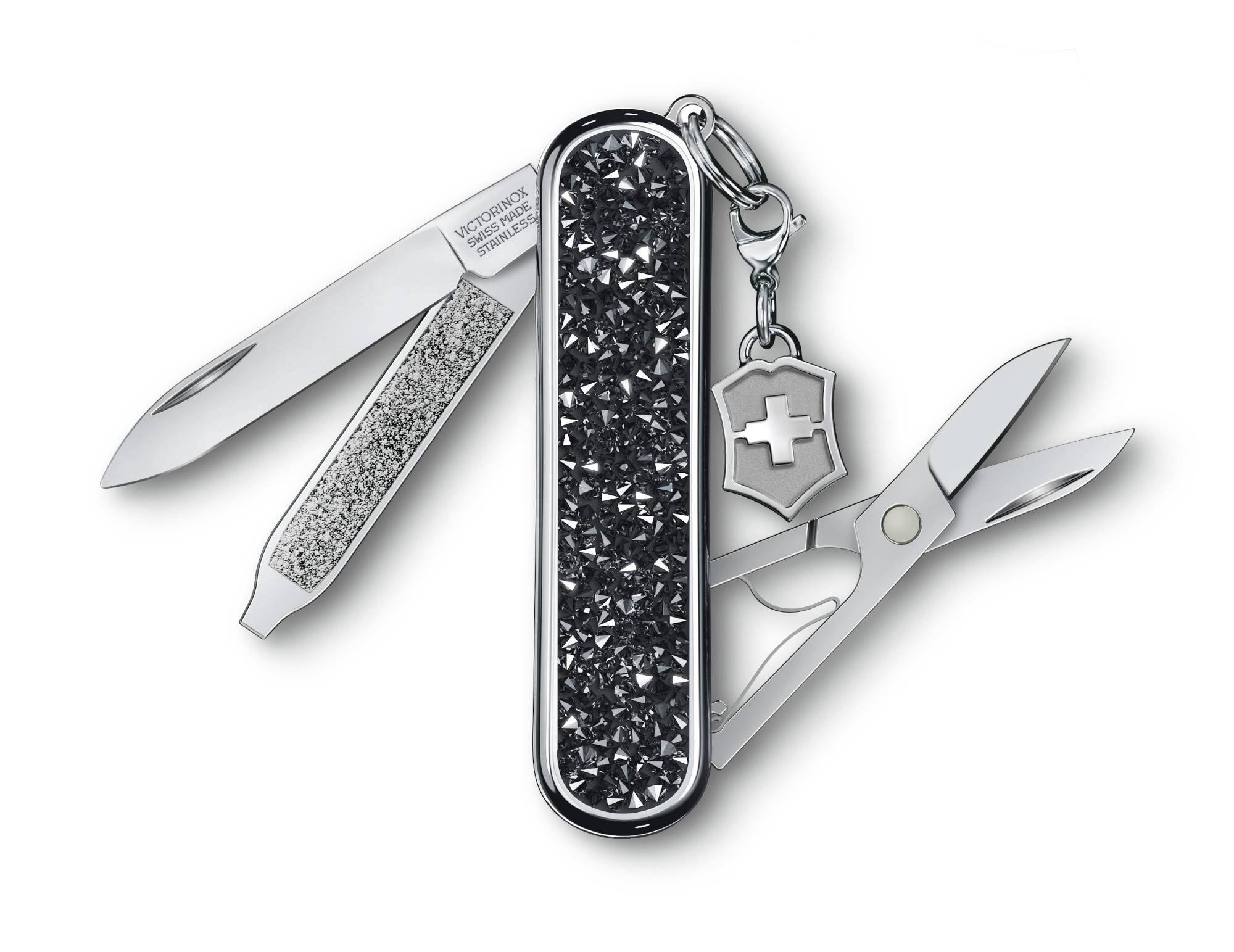 Нож-брелок Victorinox Crystal 0.6221.35 украшен кристаллами высочайшего качества, что придает ему роскошный вид и безупречную функциональность. Нержавеющая сталь.