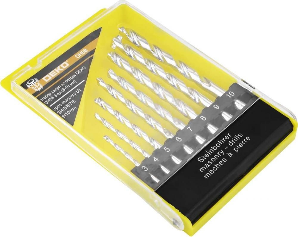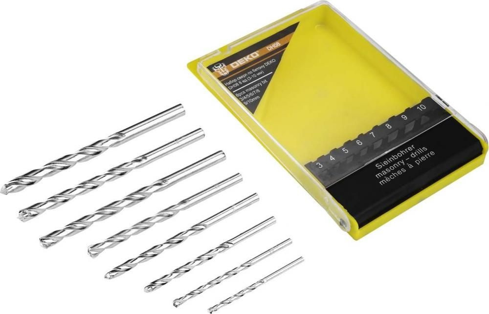 - Состав набораНабор сверл по бетону DEKO DH08 8 ед (3, 4, 5, 6, 7, 8, 9, 10 мм).