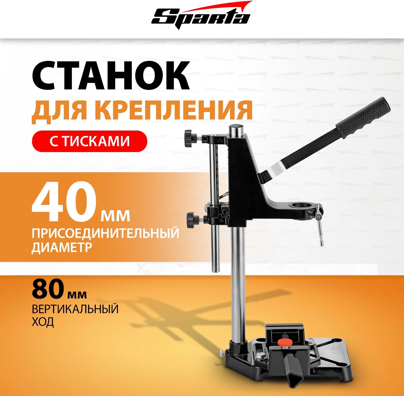 Станок для крепления дрели с тисками. Вертикальный ход - 80 мм. Присоединительный диаметр - 40 мм.