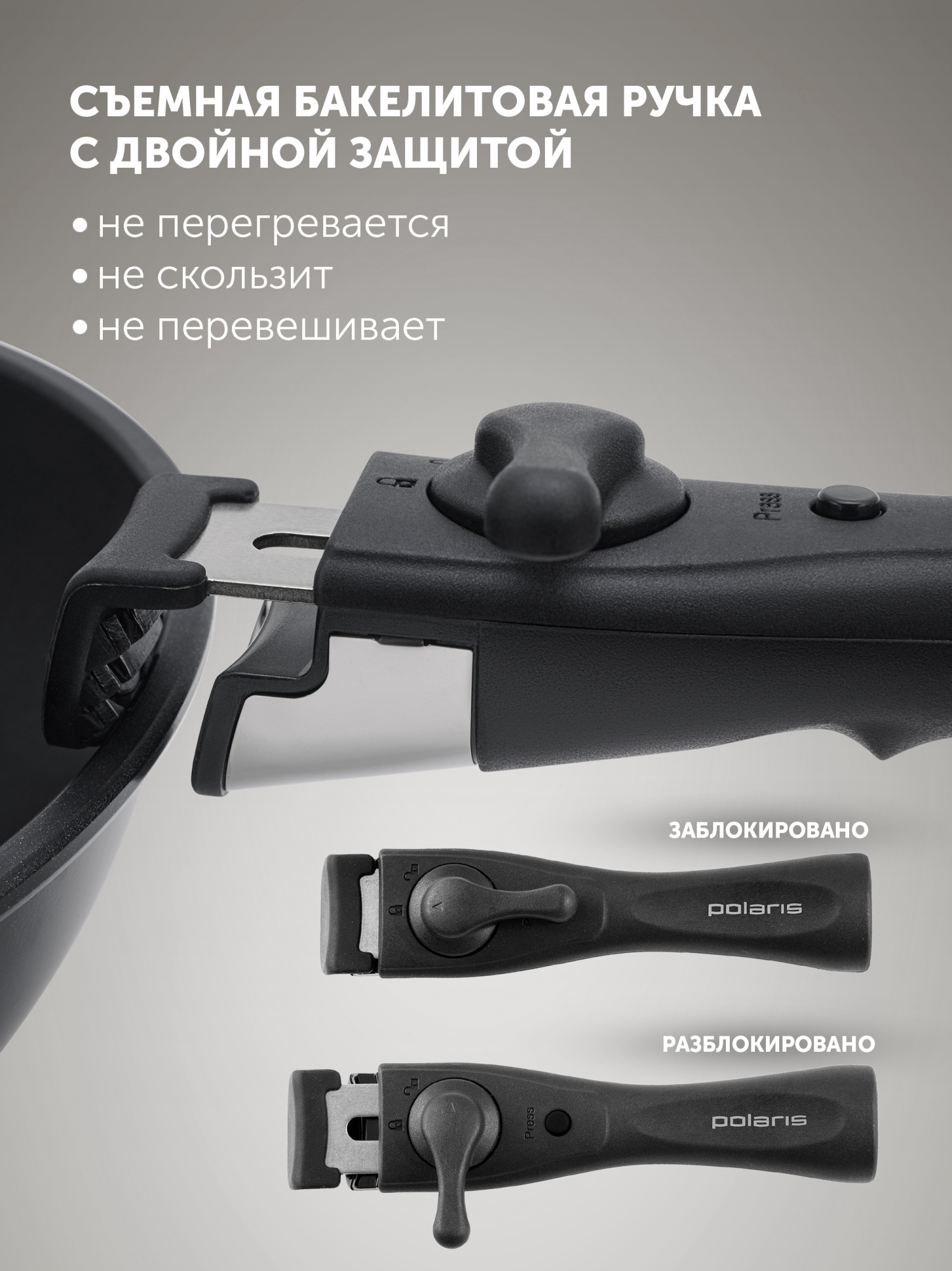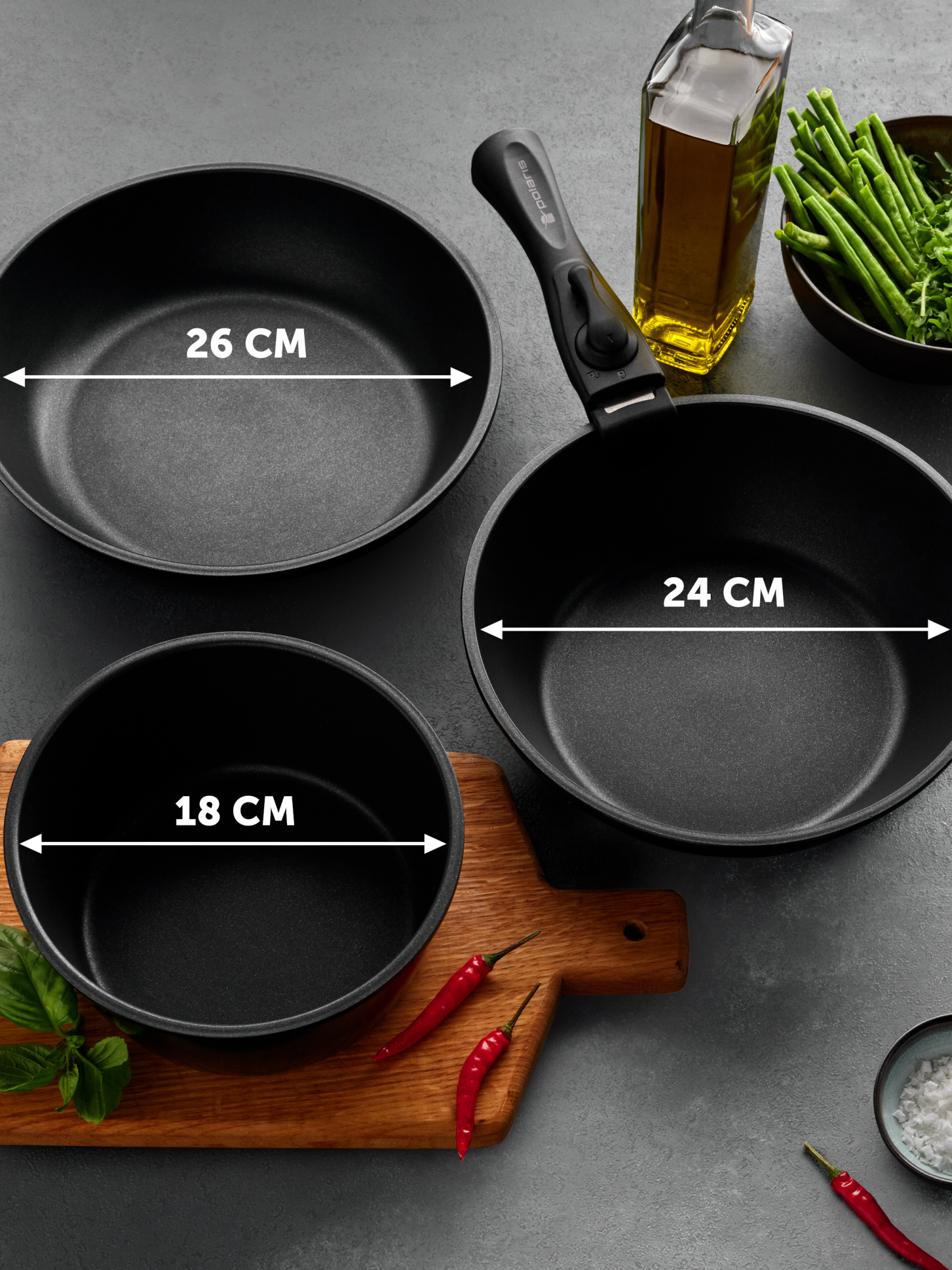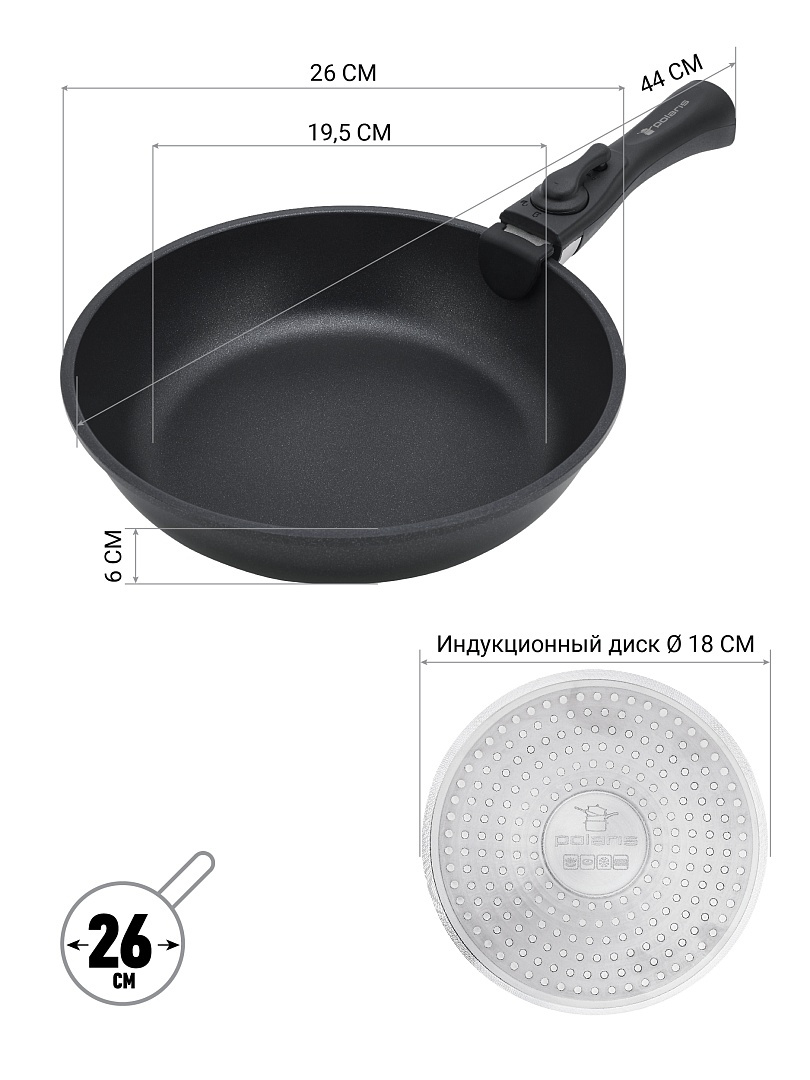 - Состав комплекта3 сковороды+1 съемная ручка