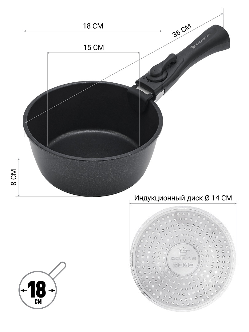 - ОсобенностиПосуда изготовлена из высококачественного кованого алюминия. Эргономичная бакелитовая съемная ручка с двойной защитой не нагревается и не скользит. Состав набора: Глубокая сковорода 24 см – 2,5 л, Сковорода 26 см – 2,5 л, Ковш 18 см – 1,7 л.