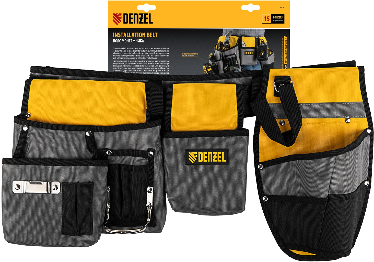 Пояс монтажника Denzel 90291 с поясными сумками и кобурой для шуруповерта позволяет иметь все необходимые инструменты под рукой во время высотных монтажных работ или решения других задач.