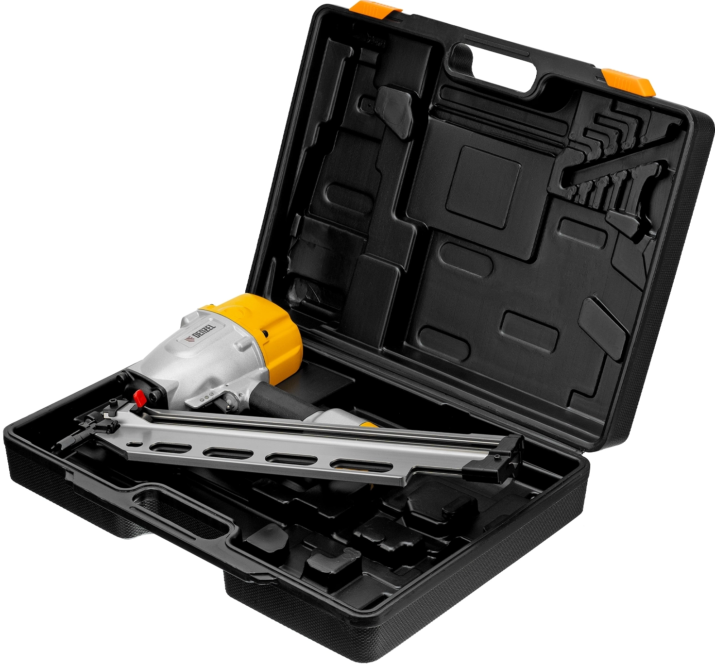 - КомплектацияНейлер пневматический, набор ключей - 4 шт., масленка, кейс.
