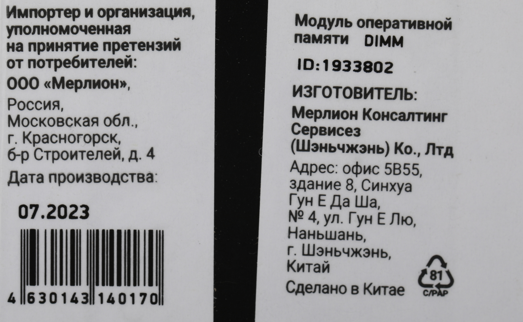 - Особенности (выводится в карточку)single rank 1R*8