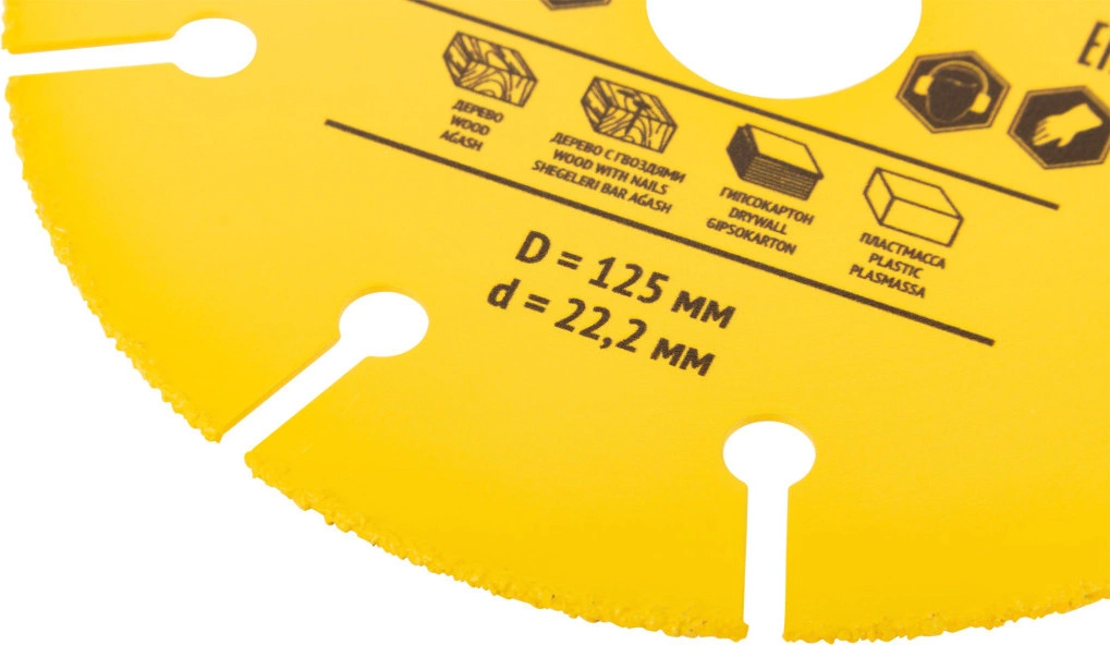 С твердосплавной режущей кромкой. Используется для резьбы, зачистки, профилирования, шлифования, нарезки и выборки пазов по дереву, продольного и поперечного реза любых пород дерева; резки дерева с гвоздями, ламината, пластмассы, гипсокартона. Для углошлифовальных машин.
