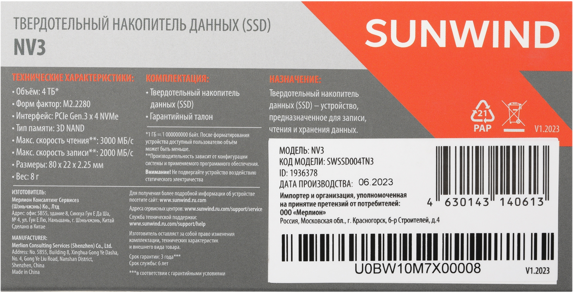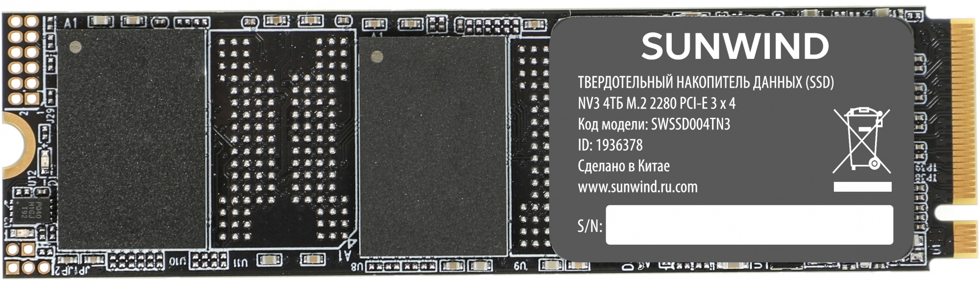 Накопитель SSD SunWind PCIe 3.0 x4 4TB SWSSD004TN3 NV3 M.2 2280