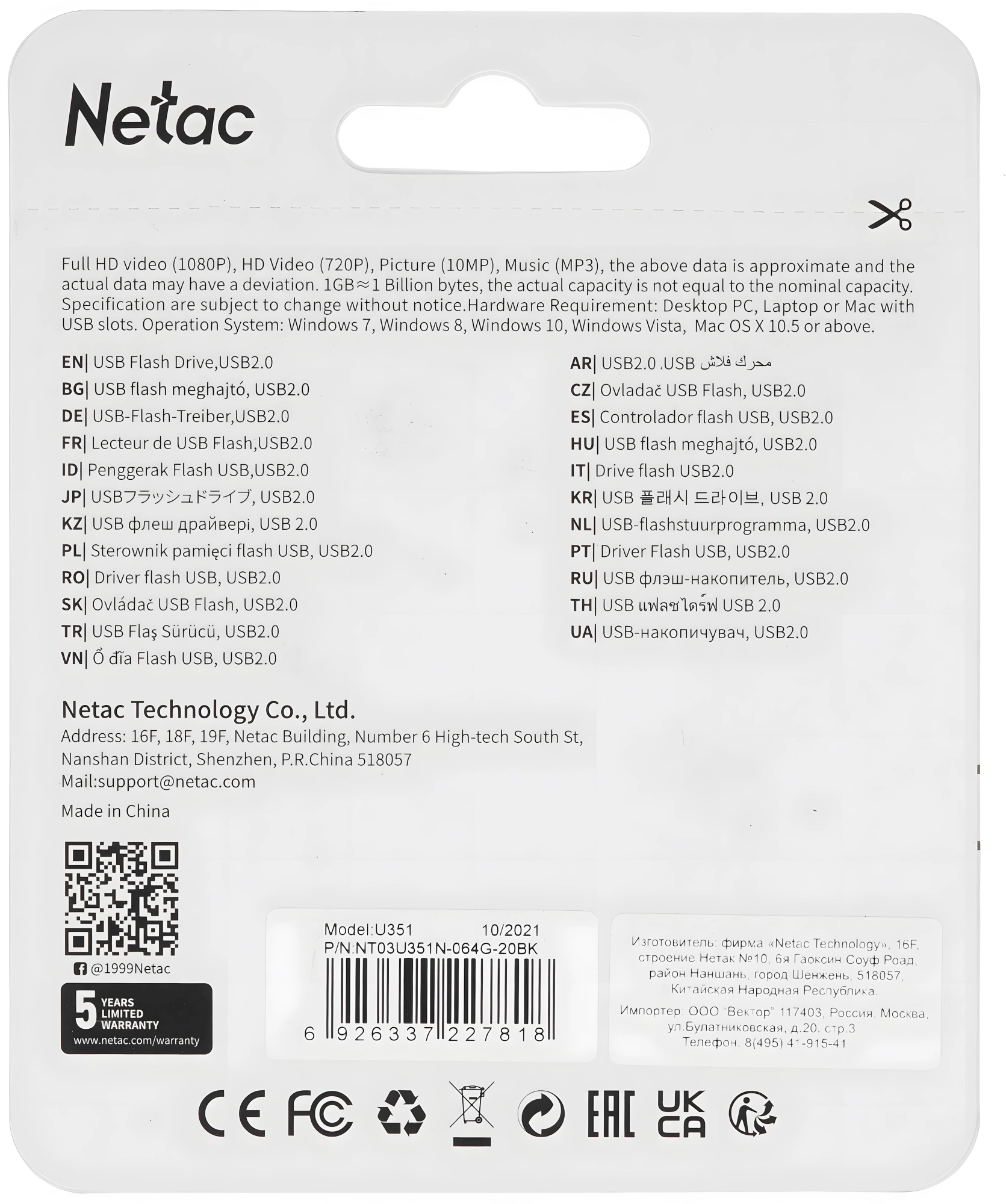 Флеш Диск Netac 64GB U351 NT03U351N-064G-20BK USB2.0 черный