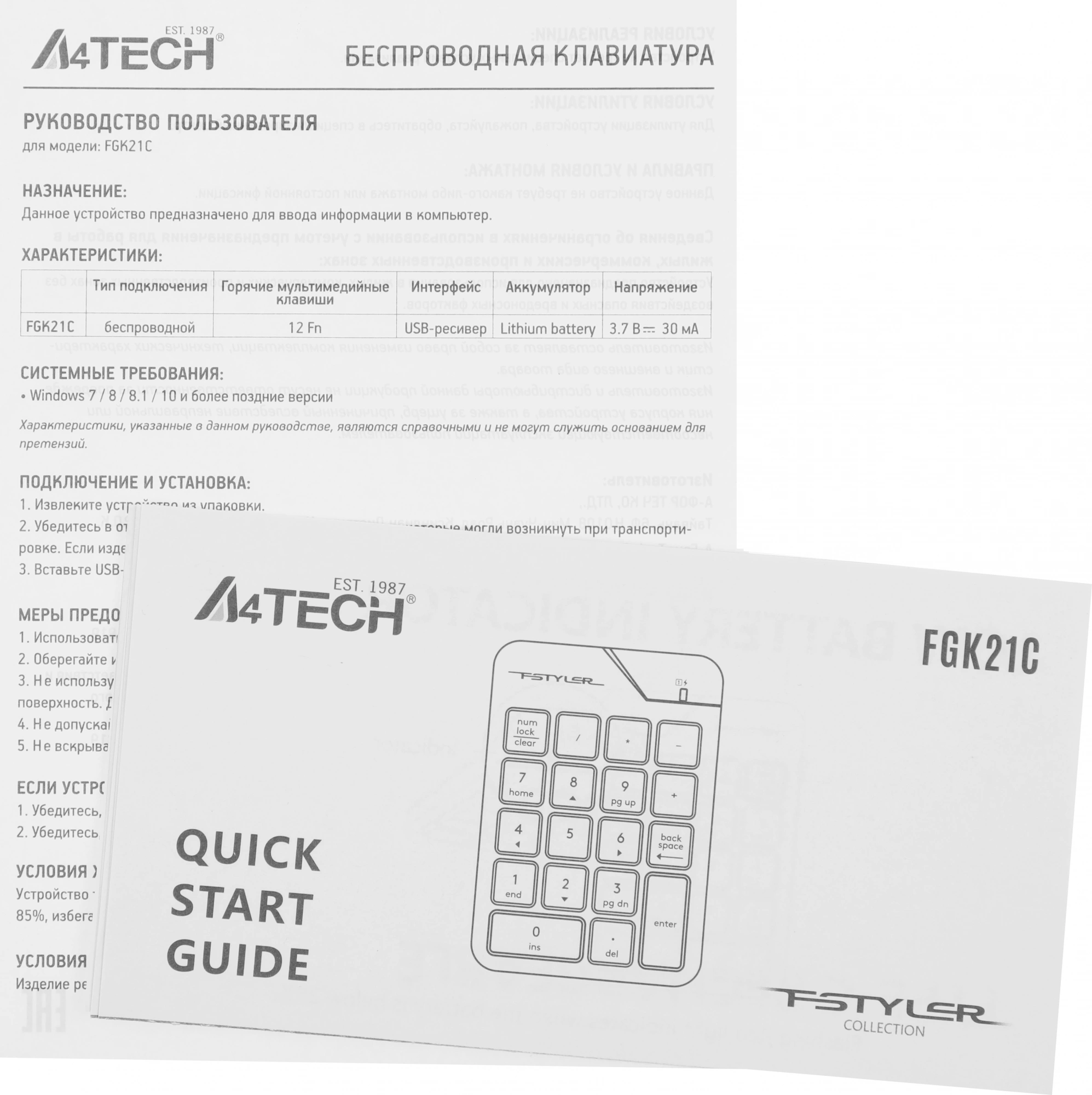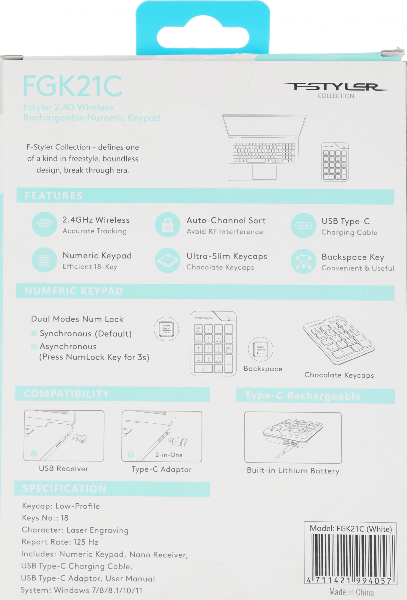 Числовой блок A4Tech FGK21C белый USB беспроводная slim для ноутбука