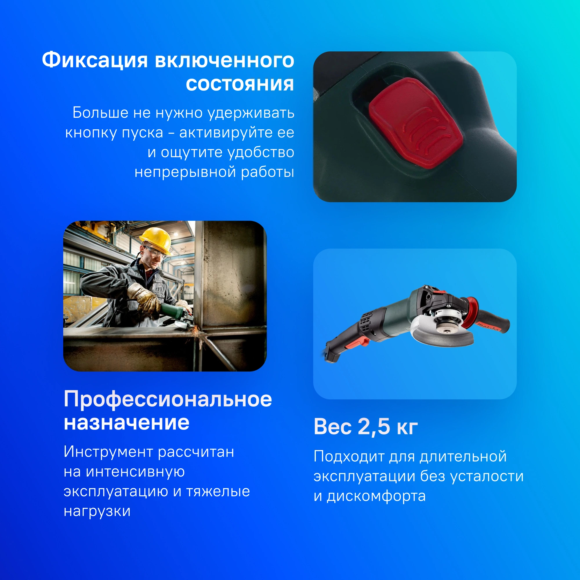 - Комплект поставкиУШМ, защитный кожух. опорный фланец. зажимная гайка M-Quick. Дополнительная рукоятка Metabo VibraTech (MVT).