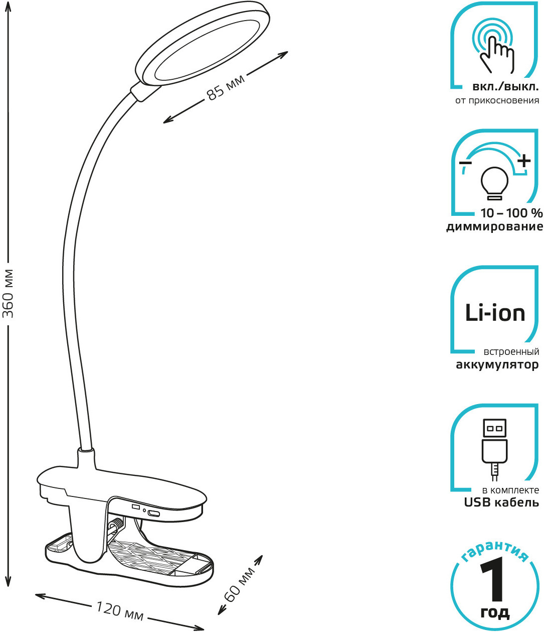 Светильник Gauss GTL205 (GT2052) настольный на прищепке LED черный 5Вт