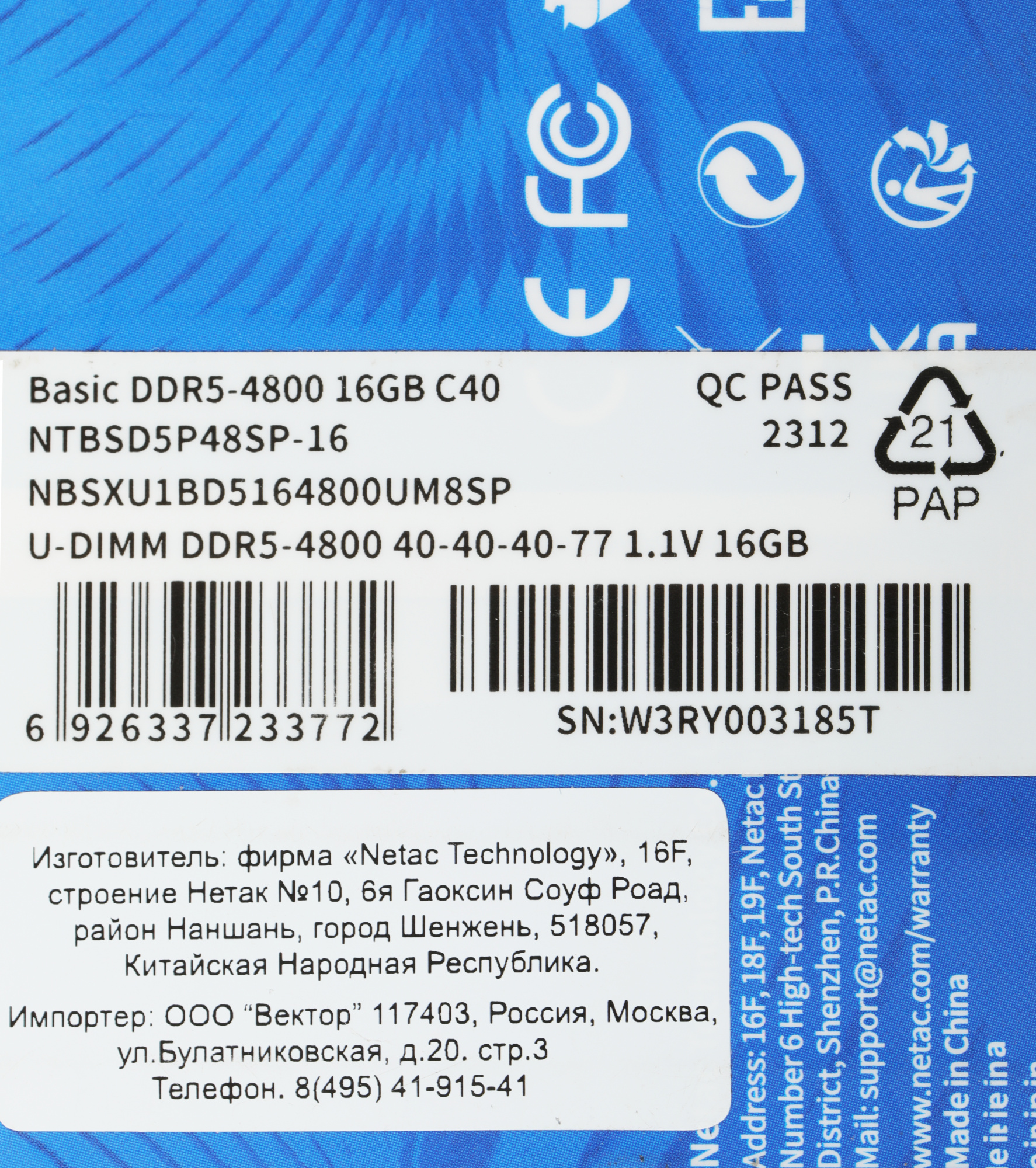 Память DDR5 16GB 4800MHz Netac NTBSD5P48SP-16 Basic RTL Gaming PC5-38400 CL40 DIMM ECC 288-pin 1.1В original Intel Ret