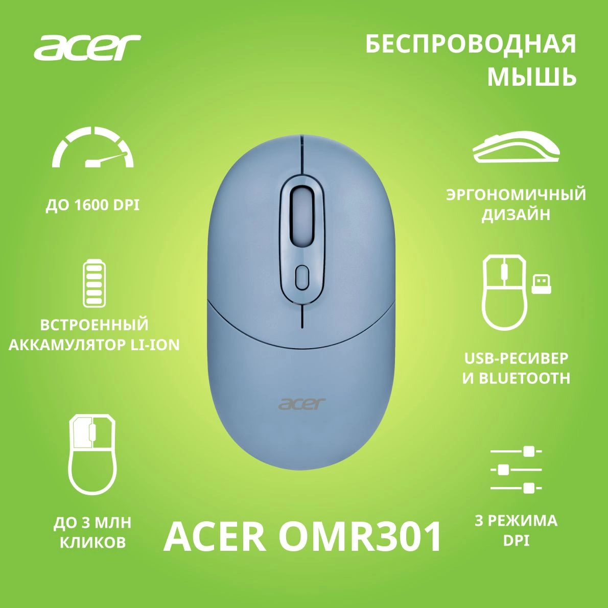 Мышь Acer OMR301 синий оптическая 1600dpi беспров. BT/Radio USB 4but (ZL.MCECC.01S)