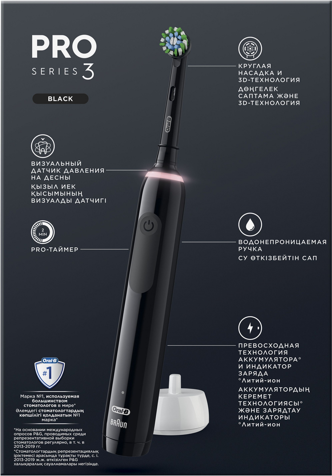 Электрическая зубная щетка Oral-B Pro Series 3 в черном водонепроницаемом корпусе подарит ощущение профессиональной чистки каждый день. Круглая насадка Cross Action, разработанная совместно со стоматологами, удаляет до 100% больше зубного налета и защищает десны.