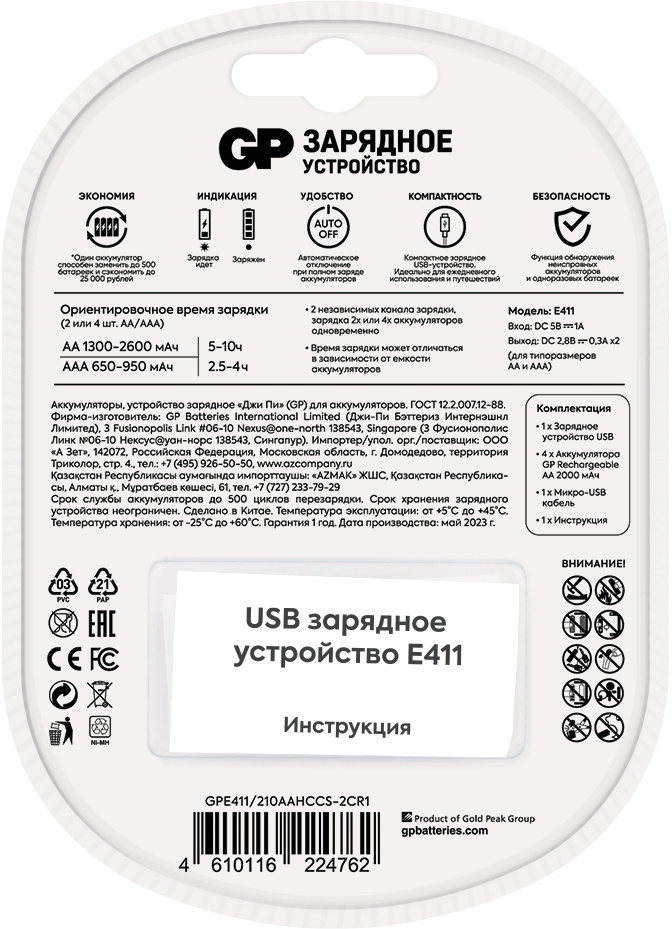Новое зарядное устройство GP Е411-210AAHCCS-2CR1 на 4 слота обеспечит аккумуляторам быструю зарядку. Устройство способно заряжать одновременно 4 батареи и рассчитано на 2 формата – АА и ААА. Входящие в комплект элементы питания предварительно заряжены. Время заряда: АА- 5-10 ч, ААА - 2,5-4 ч.