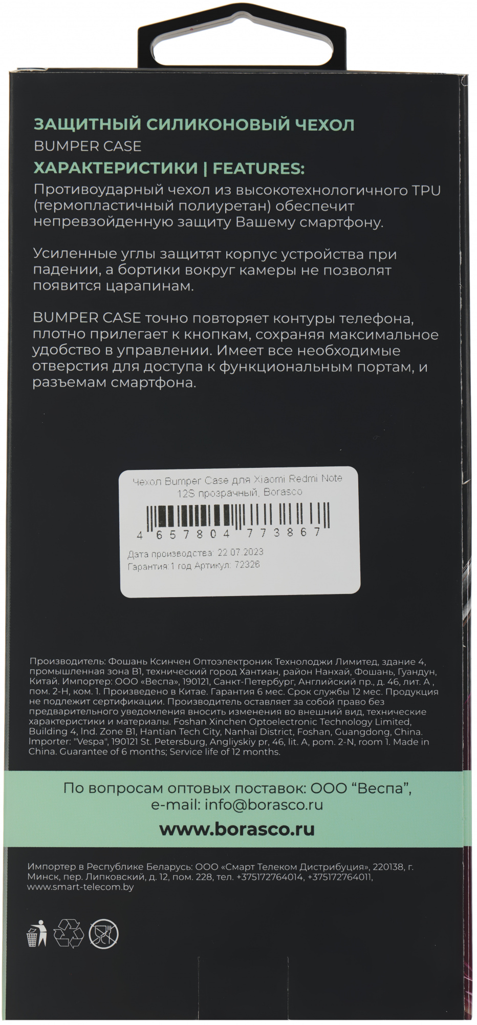 Чехол (клип-кейс) BoraSCO для Xiaomi Redmi Note 12S Bumper Case прозрачный (72326)