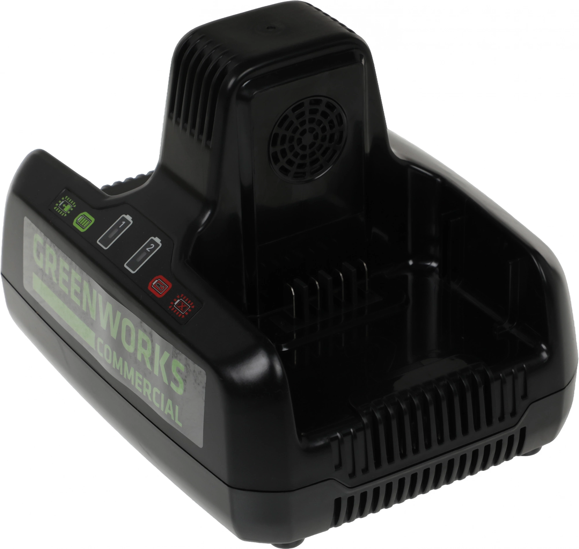 Зарядное устройство на 2 слота Greenworks G82C2 82V применяется для ускоренной зарядки двух аккумуляторов напряжением 82 вольт одновременно и емкостью 2.5 А/ч, 5 А/ч.