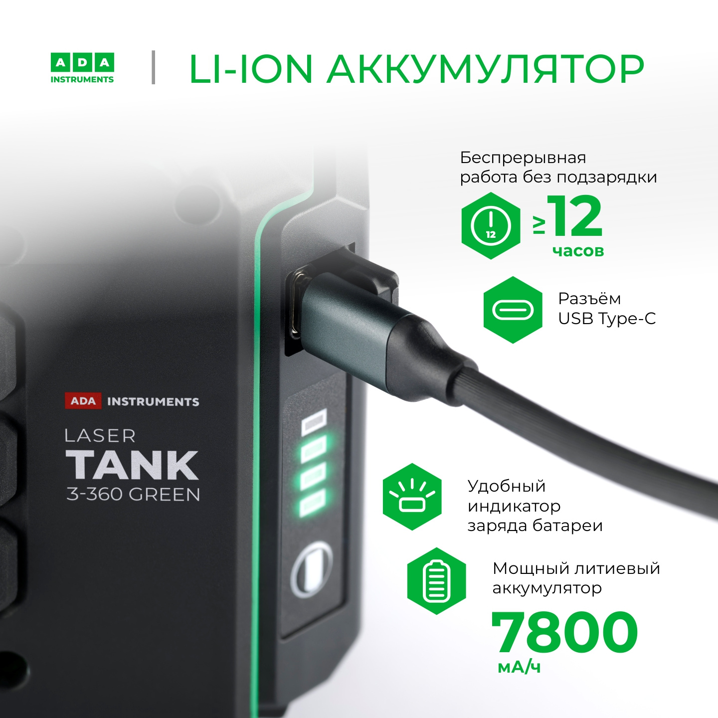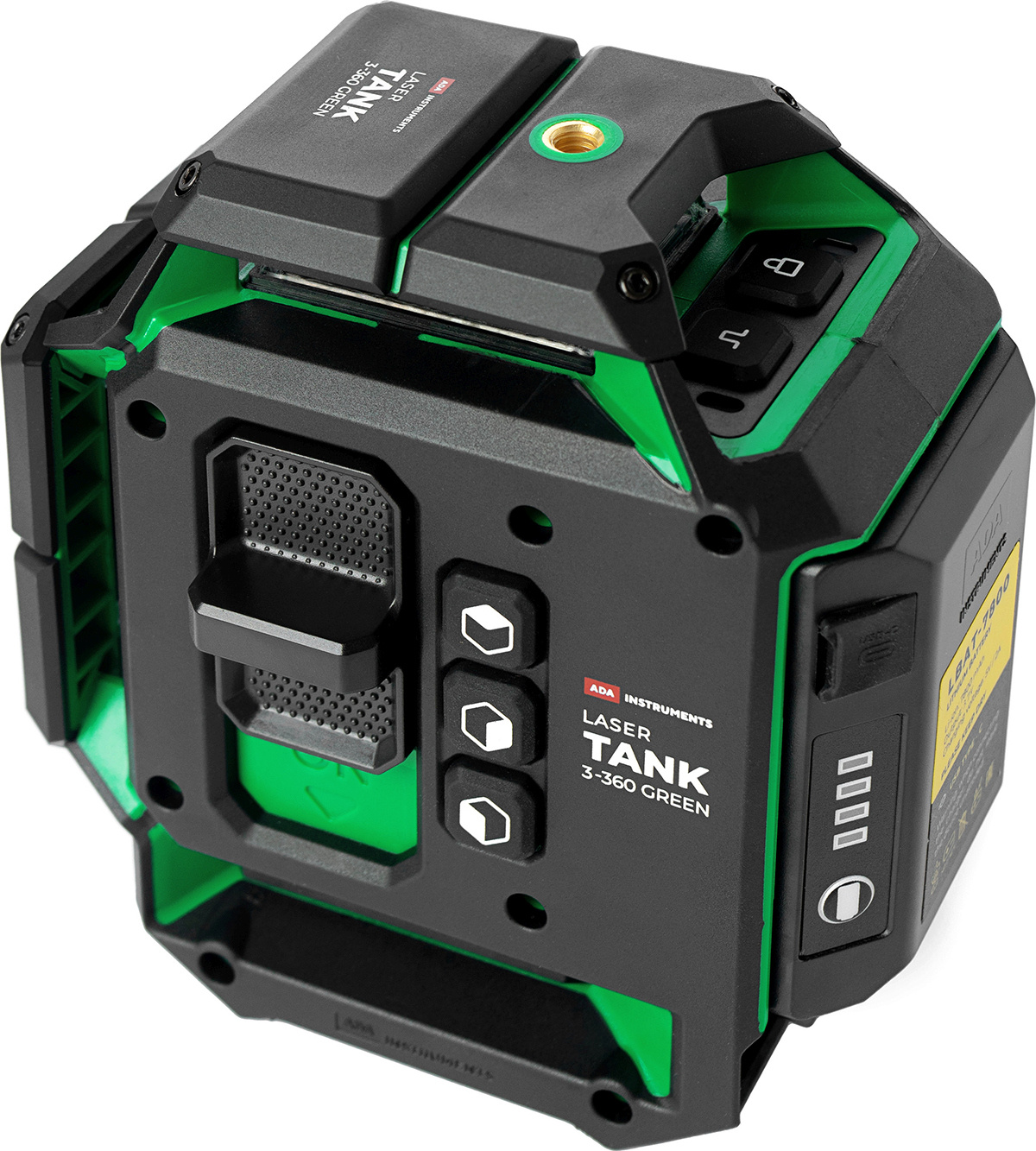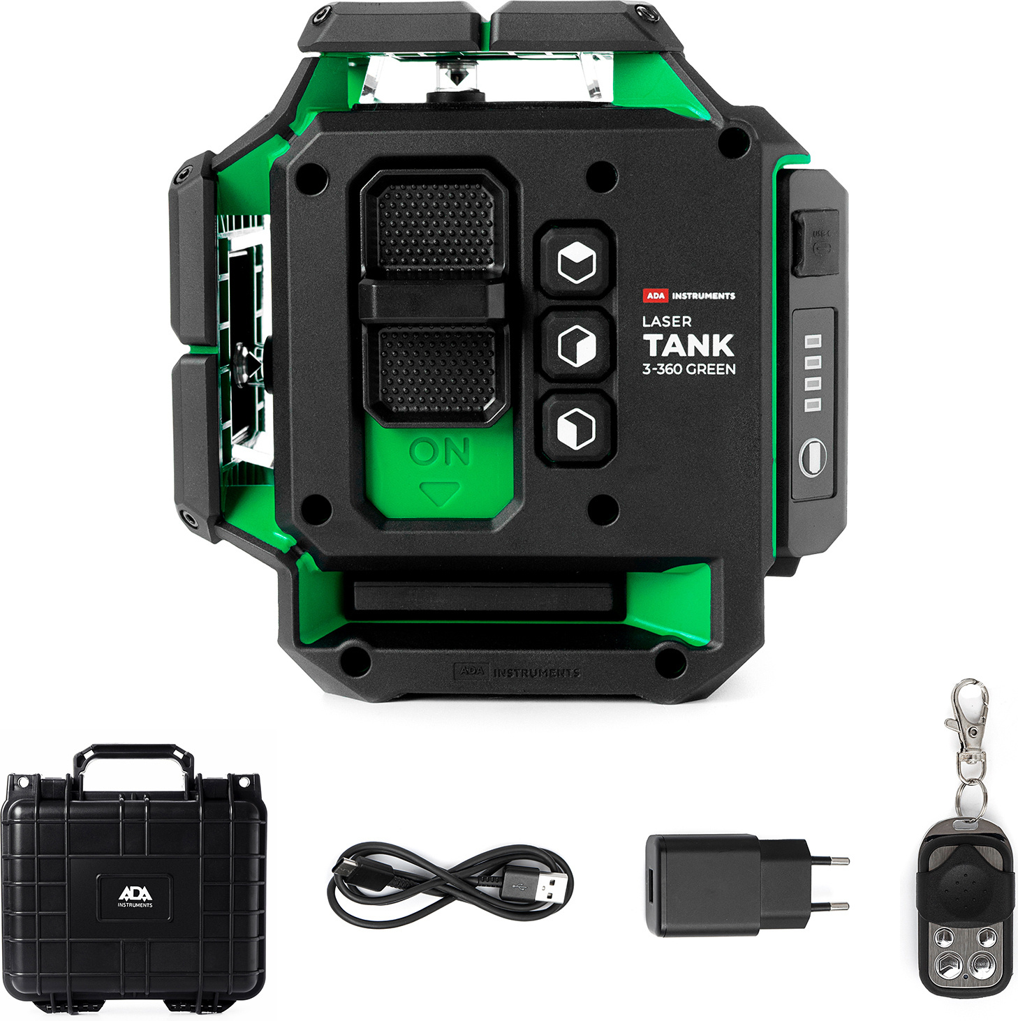 ADA LaserTANK 3-360 GREEN Basic Edition – профессиональный лазерный уровень ADA Instruments проецирующий три линии 360 град. Взаимно перпендикулярные линии (одна горизонтальная и две вертикальные) позволяют выполнить абсолютно любую разметку.