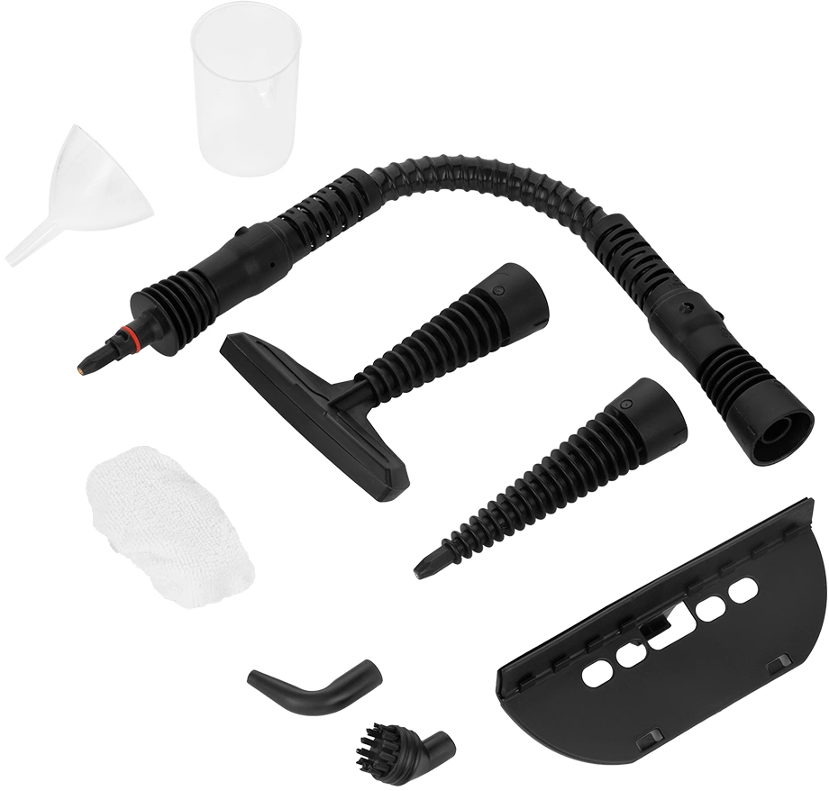 - Насадки в комплектеСтруйная насадка, угловая насадка, круглая нейлоновая щетка, паровой шланг, насадка для отпаривания, тряпка для отпаривания, насадка с резиновым скребком.