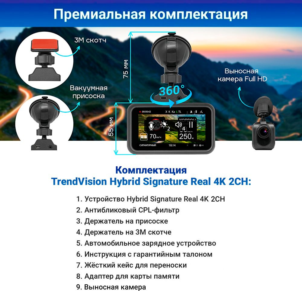 - КомплектацияУстройство Hybrid Signature Real 4K 2CH Антибликовый CPL-фильтр Держатель на присоске Держатель на 3М скотче Автомобильное зарядное устройство Инструкция с гарантийным талоном Жёсткий кейс для переноски Адаптер для карты памяти Задняя Full HD камера