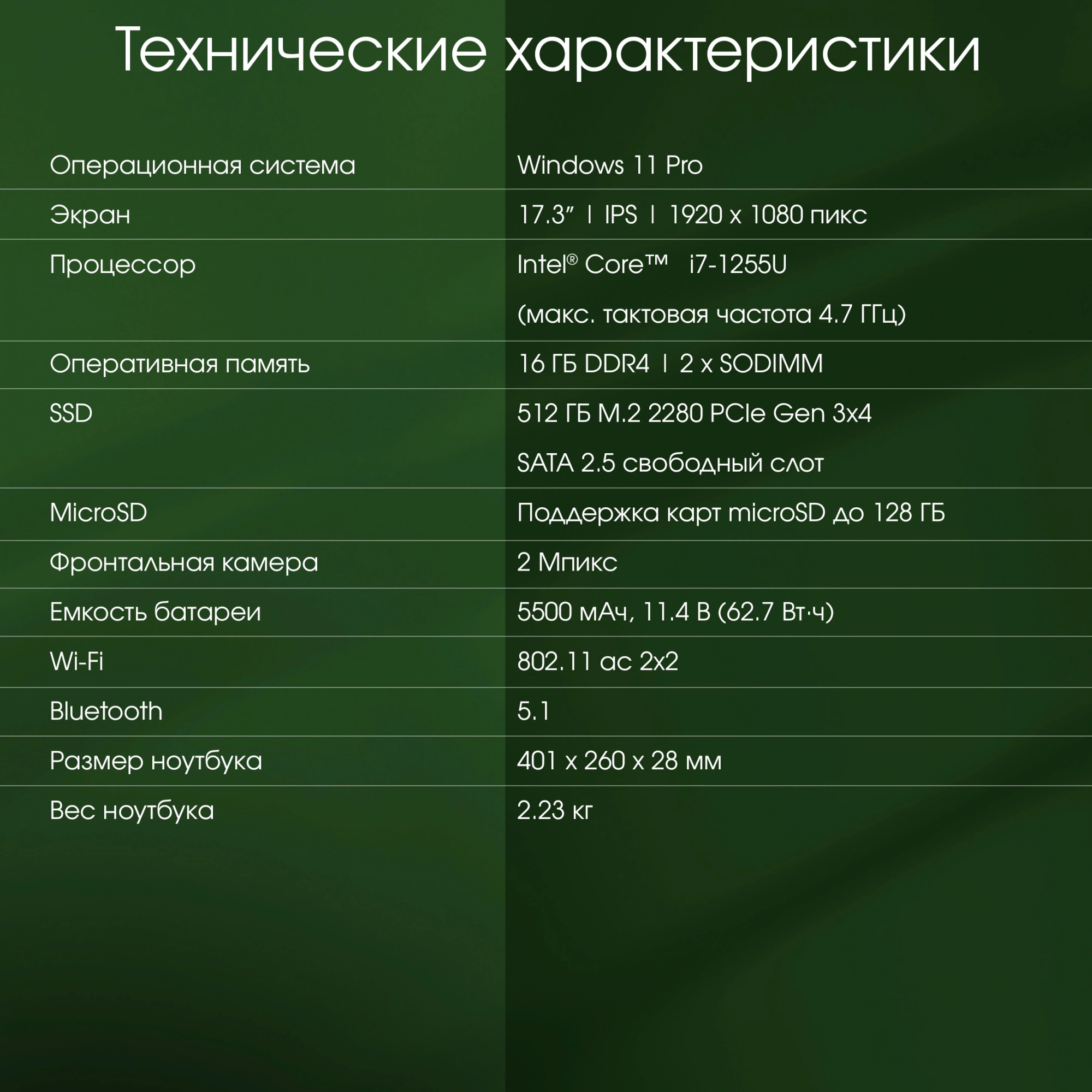 Ноутбук Digma Pro Fortis M Core i7 1255U 16Gb SSD512Gb Intel UHD Graphics 17.3" IPS FHD (1920x1080) Windows 11 Pro grey WiFi BT Cam 5500mAh (DN17P7-ADXW01)