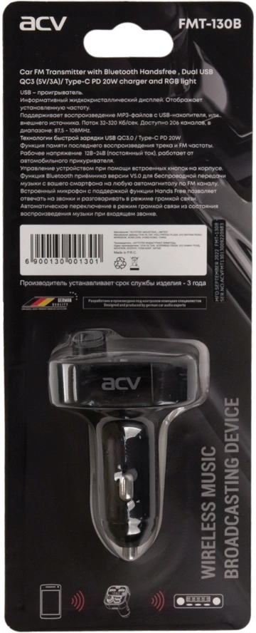 Автомобильный FM-модулятор ACV FMT-130B черный BT USB (40580)