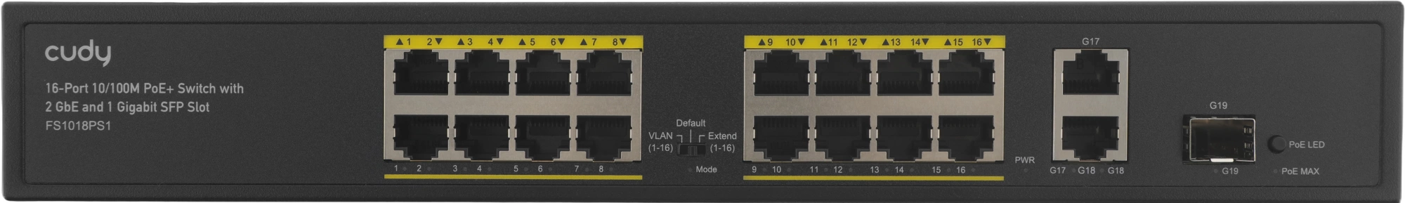 Коммутатор Cudy FS1018PS1 (L2) 16x100Мбит/с 2x1Гбит/с 1SFP 16PoE+ 200W неуправляемый