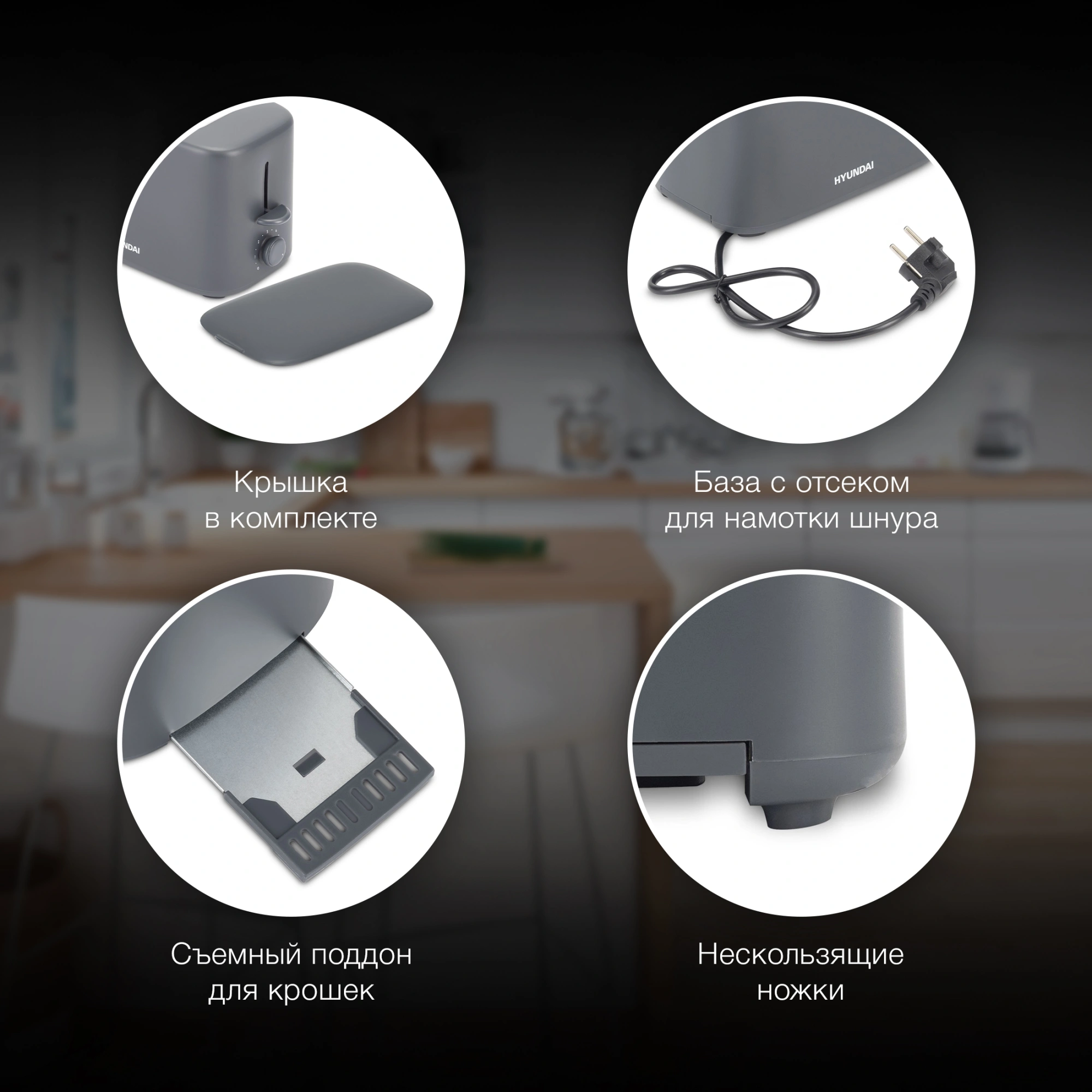 - Конструктивные особенностивыдвижной лоток для крошек, нескользящая основа, отсек для шнура