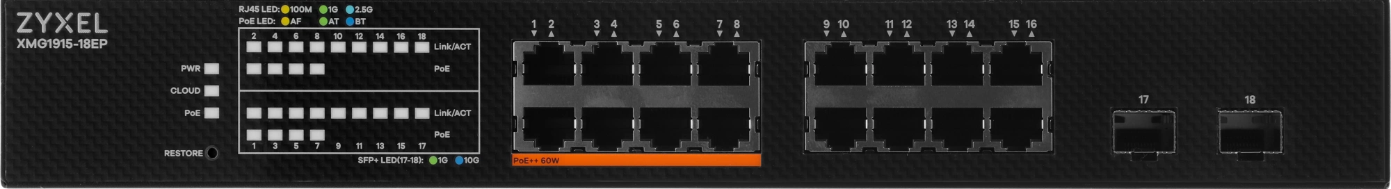 Коммутатор Zyxel XMG1915-18EP-EU0101F (L2+) 16x2.5Гбит/с 2SFP+ 8PoE++ 180W управляемый